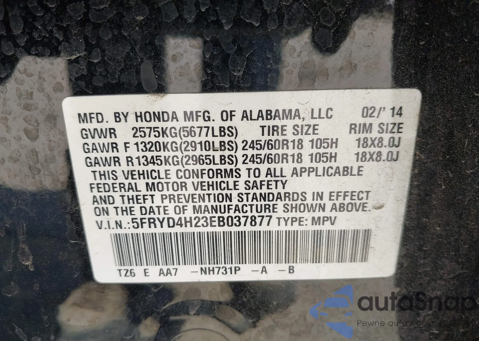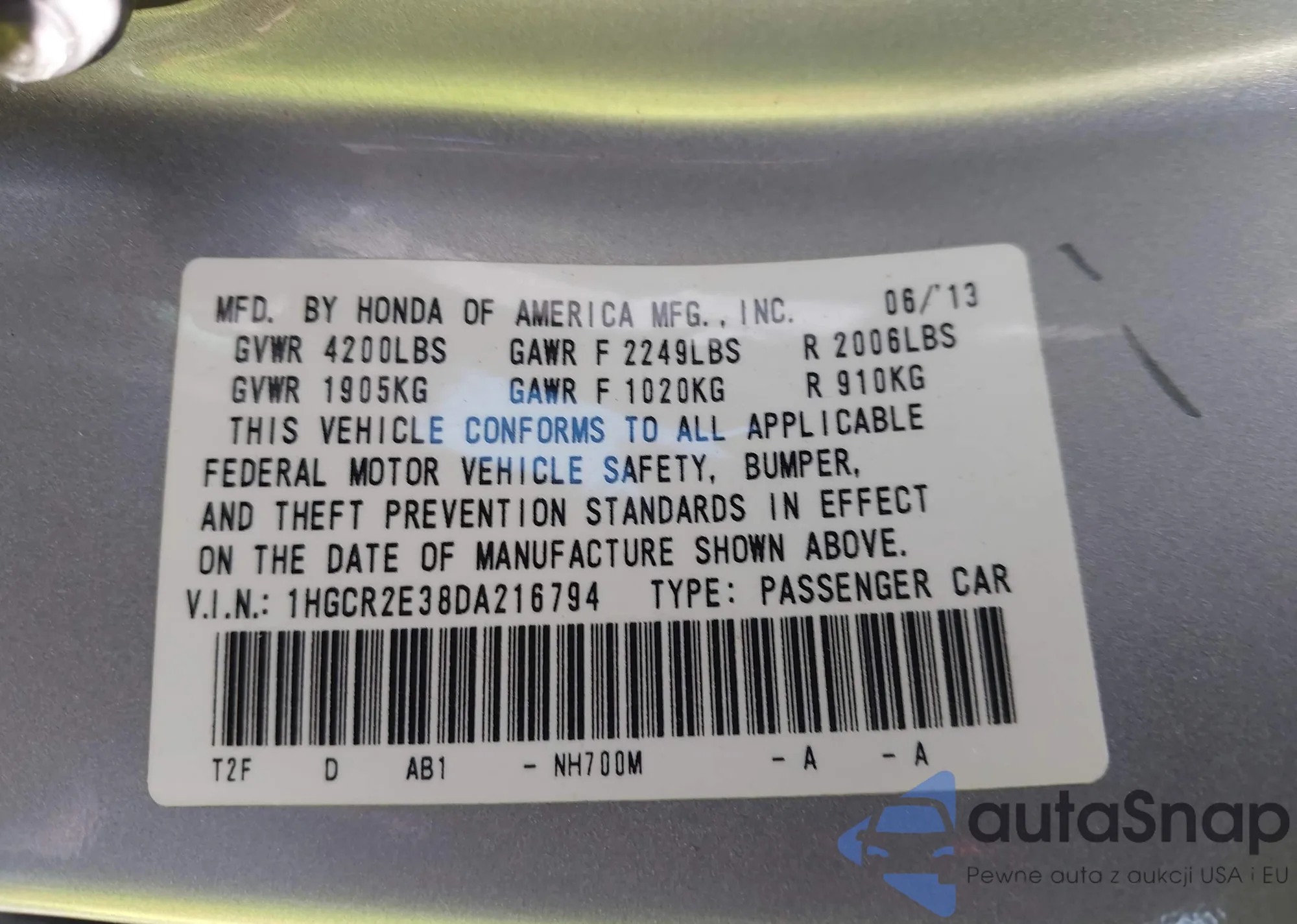 • VIN 1HGCR2E38DA216794