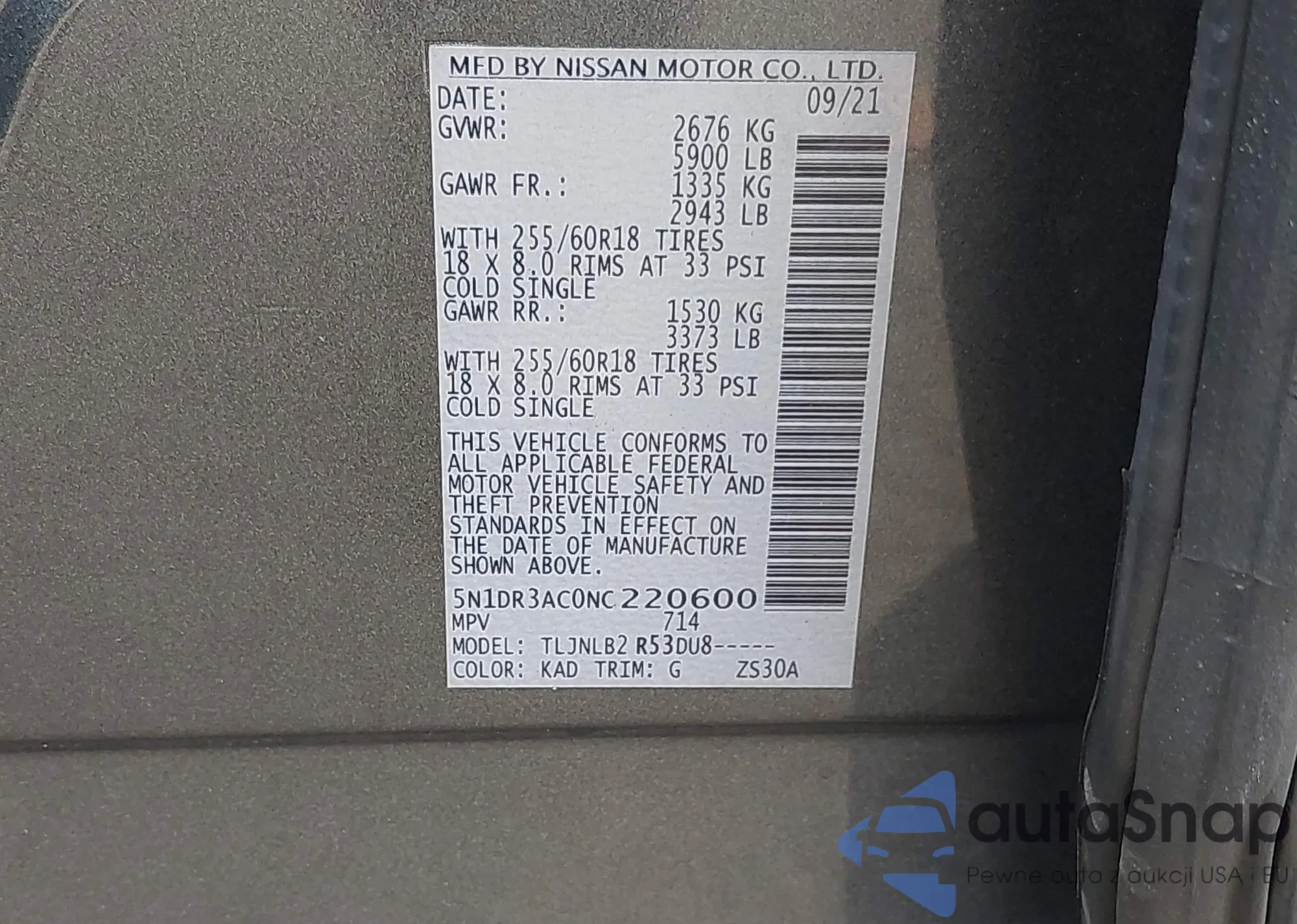 • VIN 5N1DR3AC0NC220600