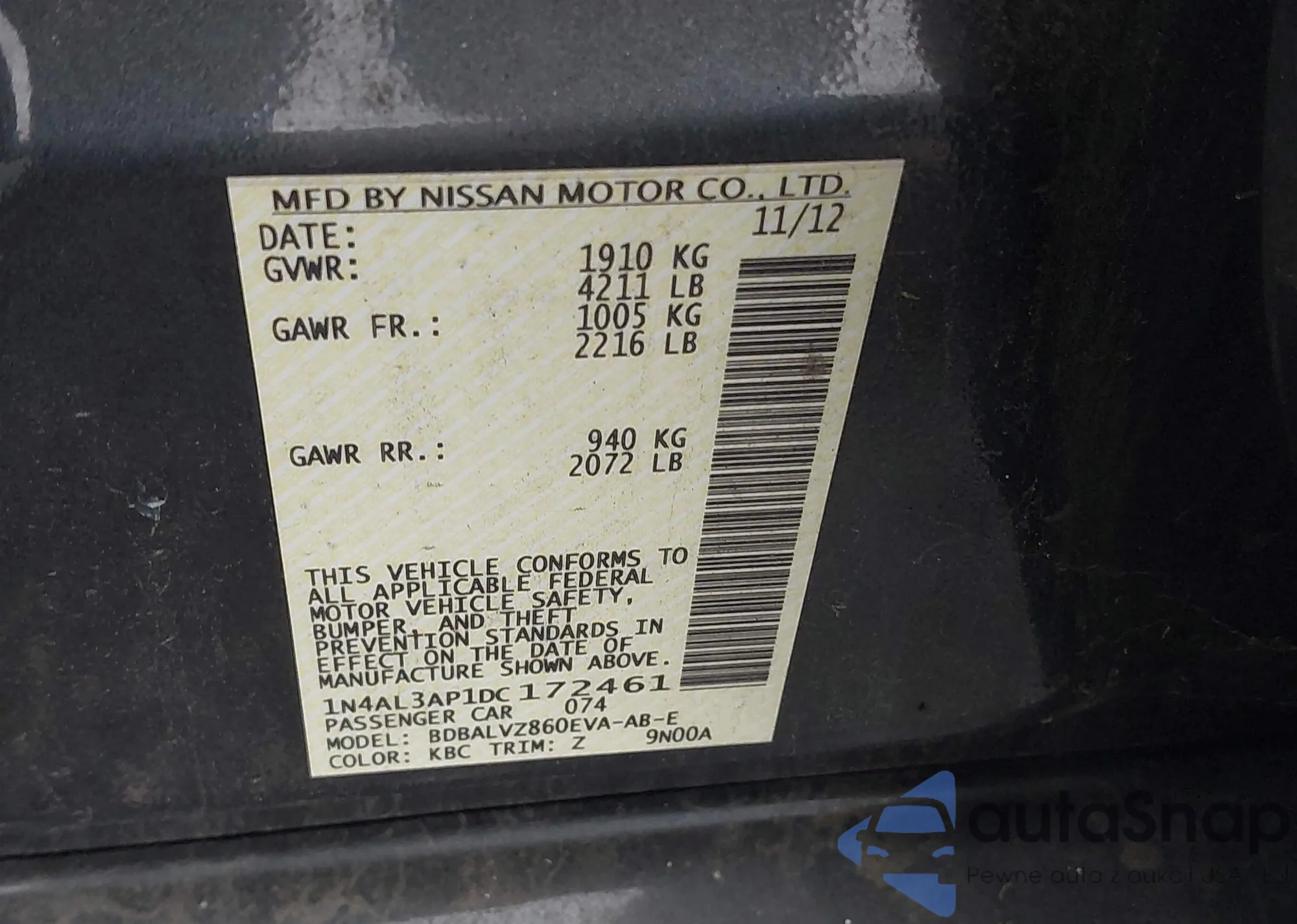 • VIN 1N4AL3AP1DC172461