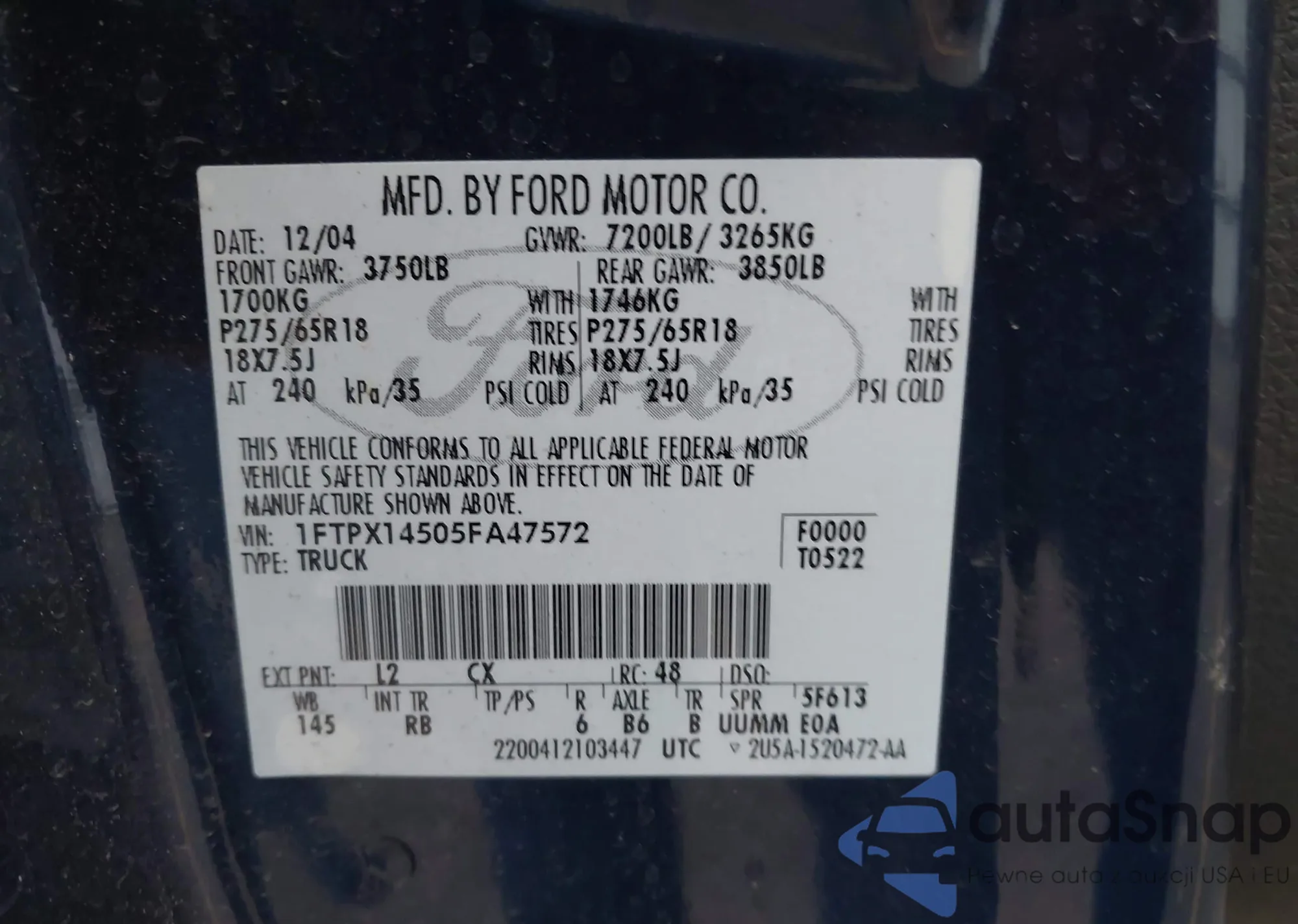 LOT: 43467010 VIN: 1FTPX14505FA47572