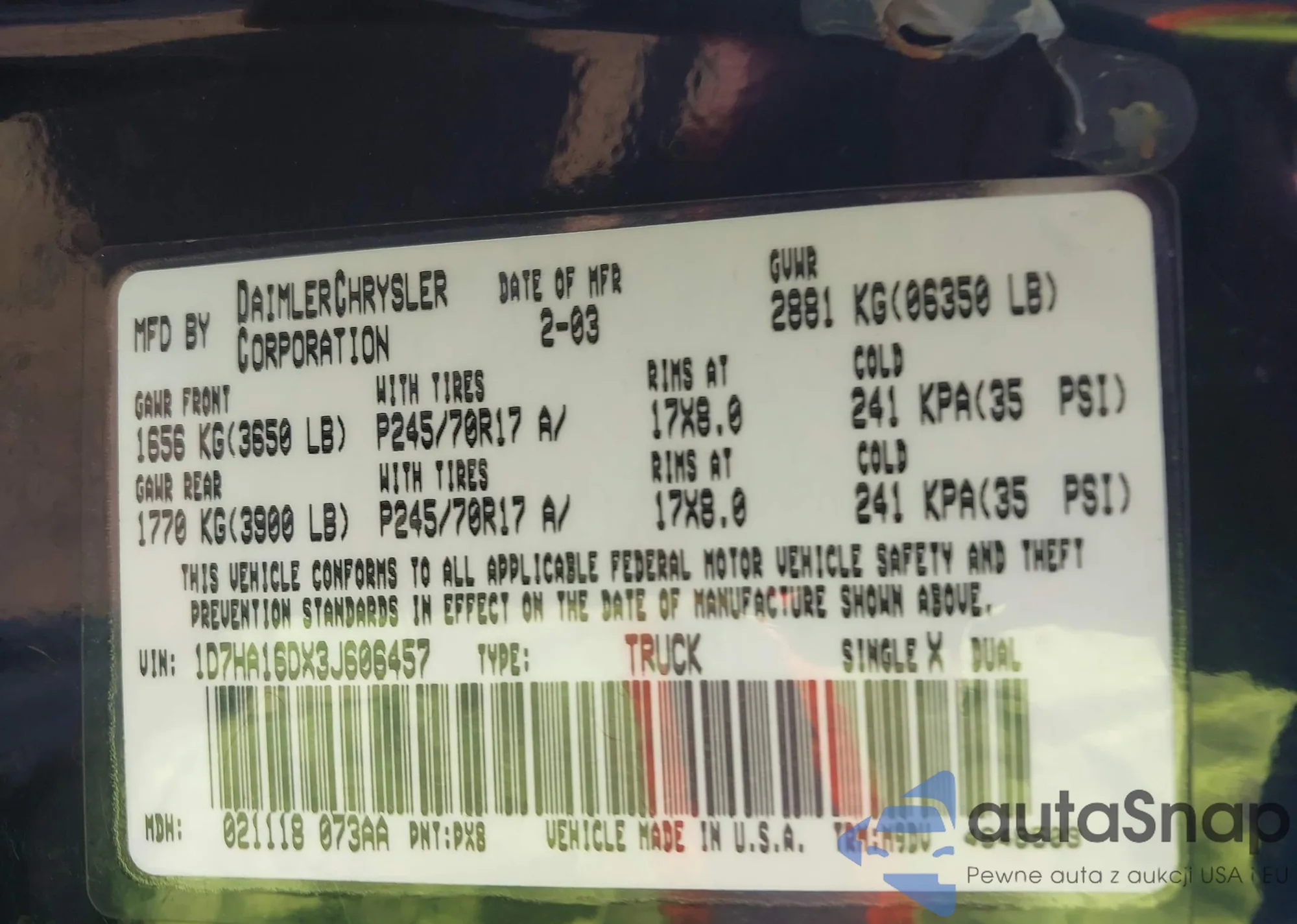 • VIN 1D7HA16DX3J606457
