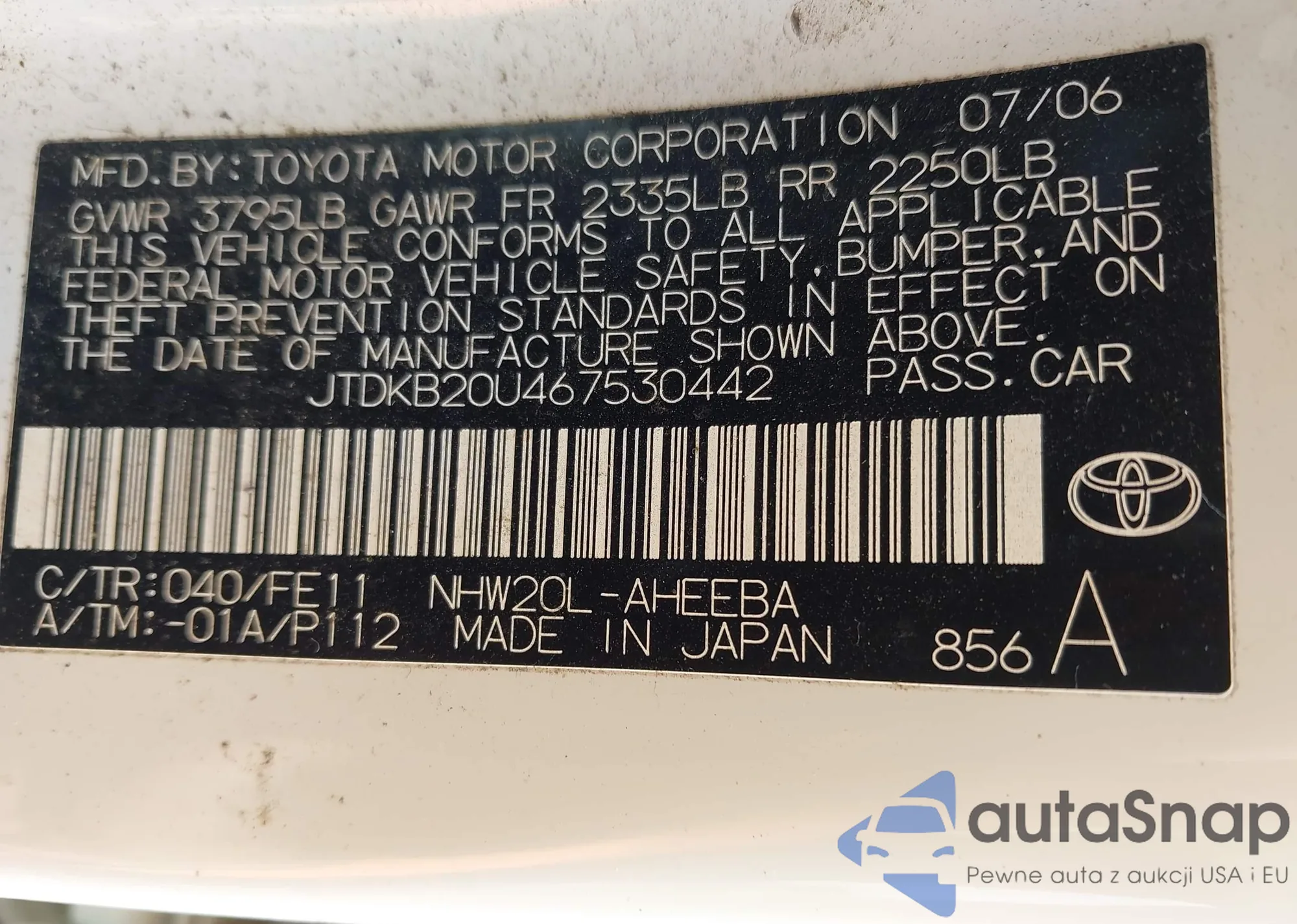 LOT: 43668380 VIN: JTDKB20U467530442