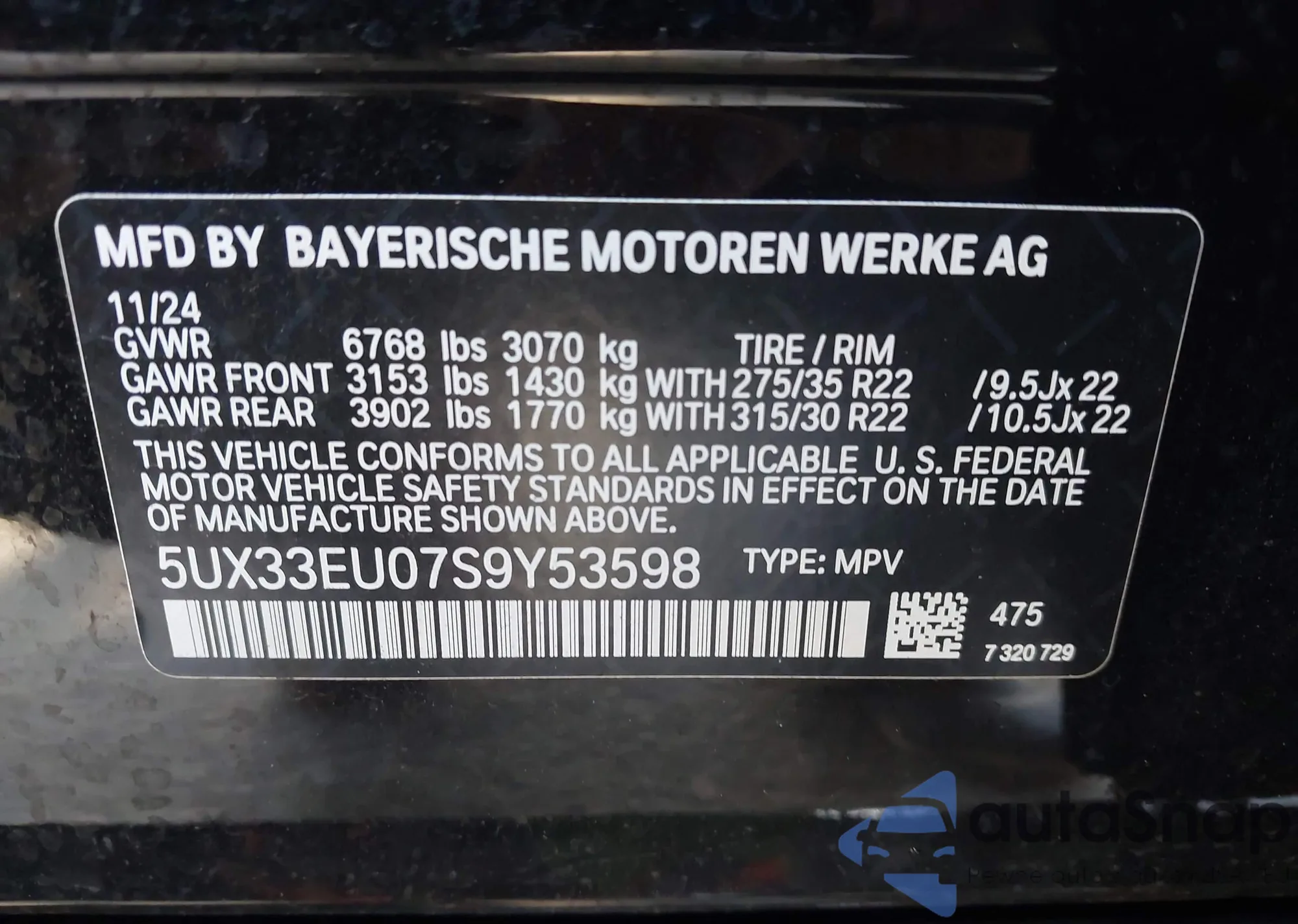• VIN 5UX33EU07S9Y53598