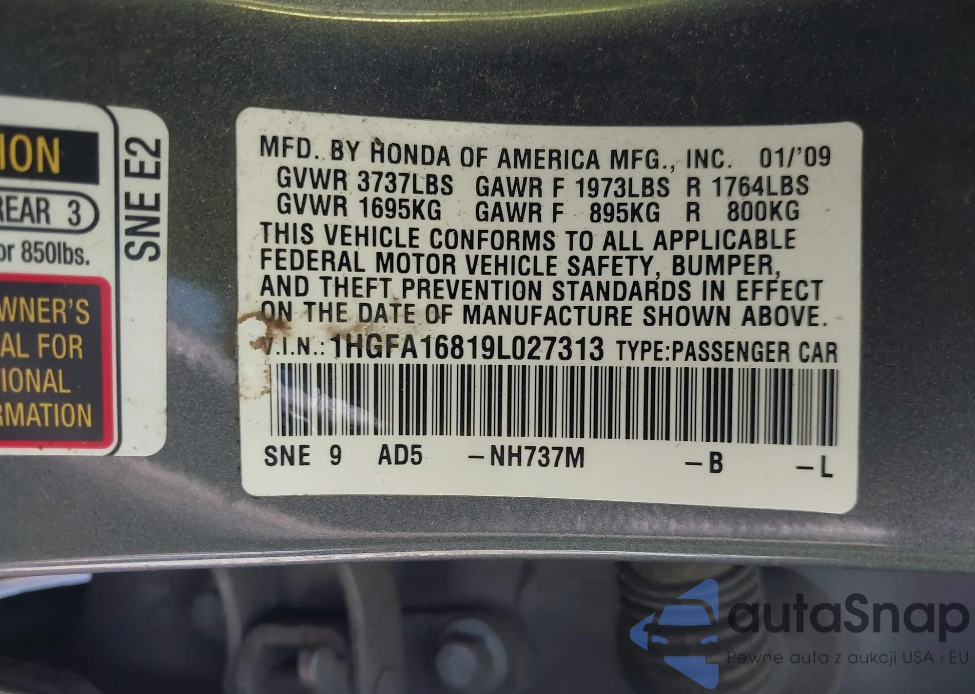 • VIN 1HGFA16819L027313