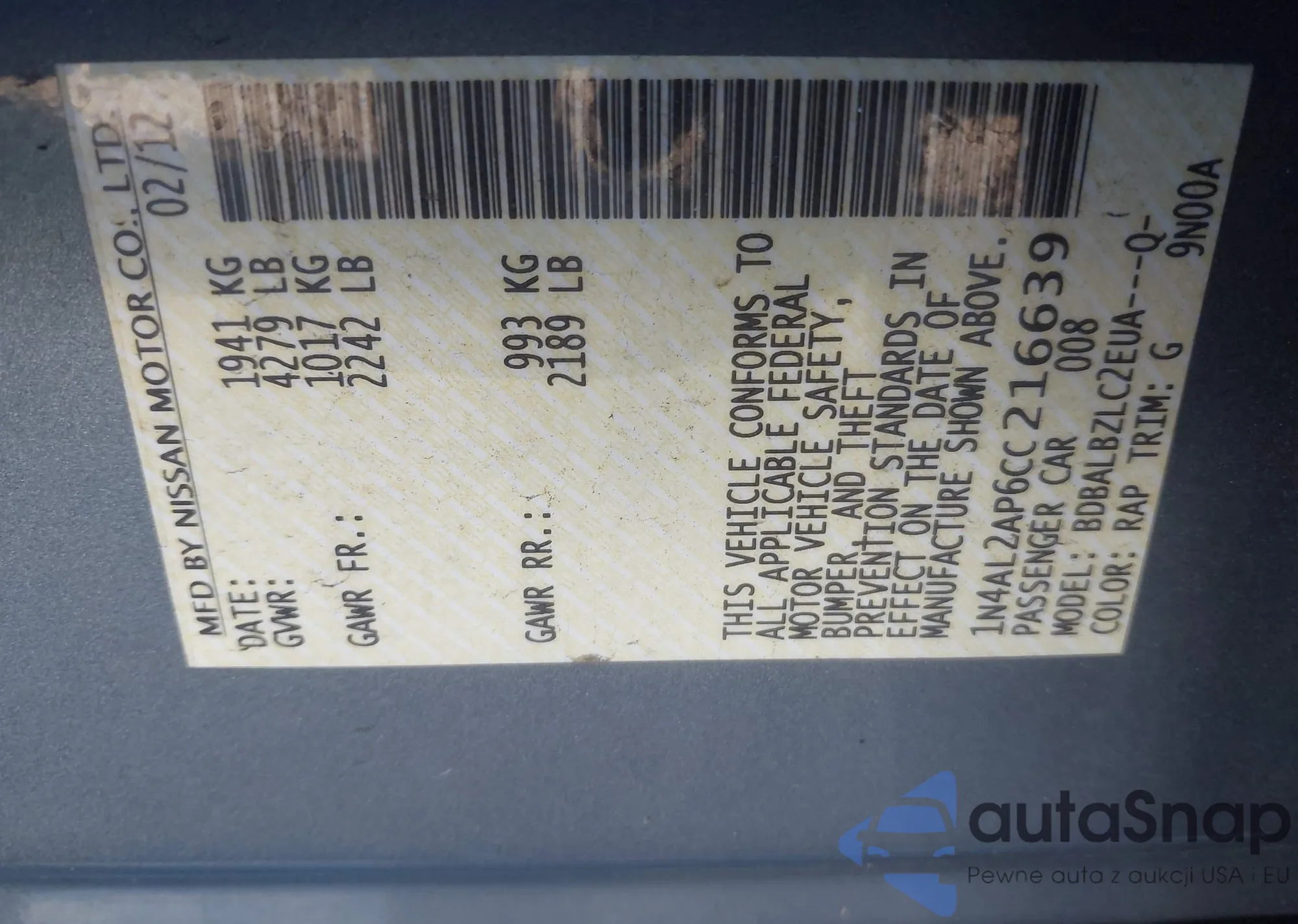 LOT: 43531411 VIN: 1N4AL2AP6CC216639