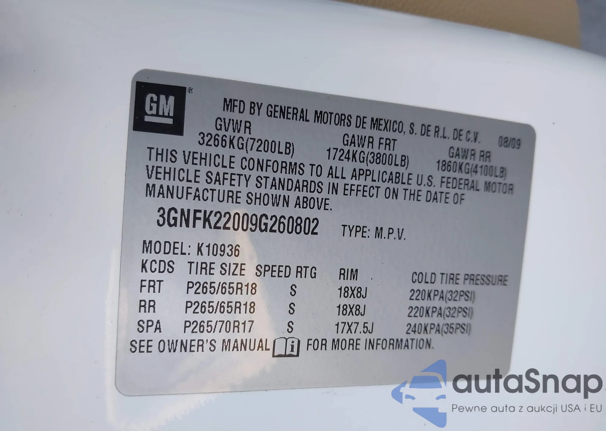 LOT: 43629697 VIN: 3GNFK22009G260802