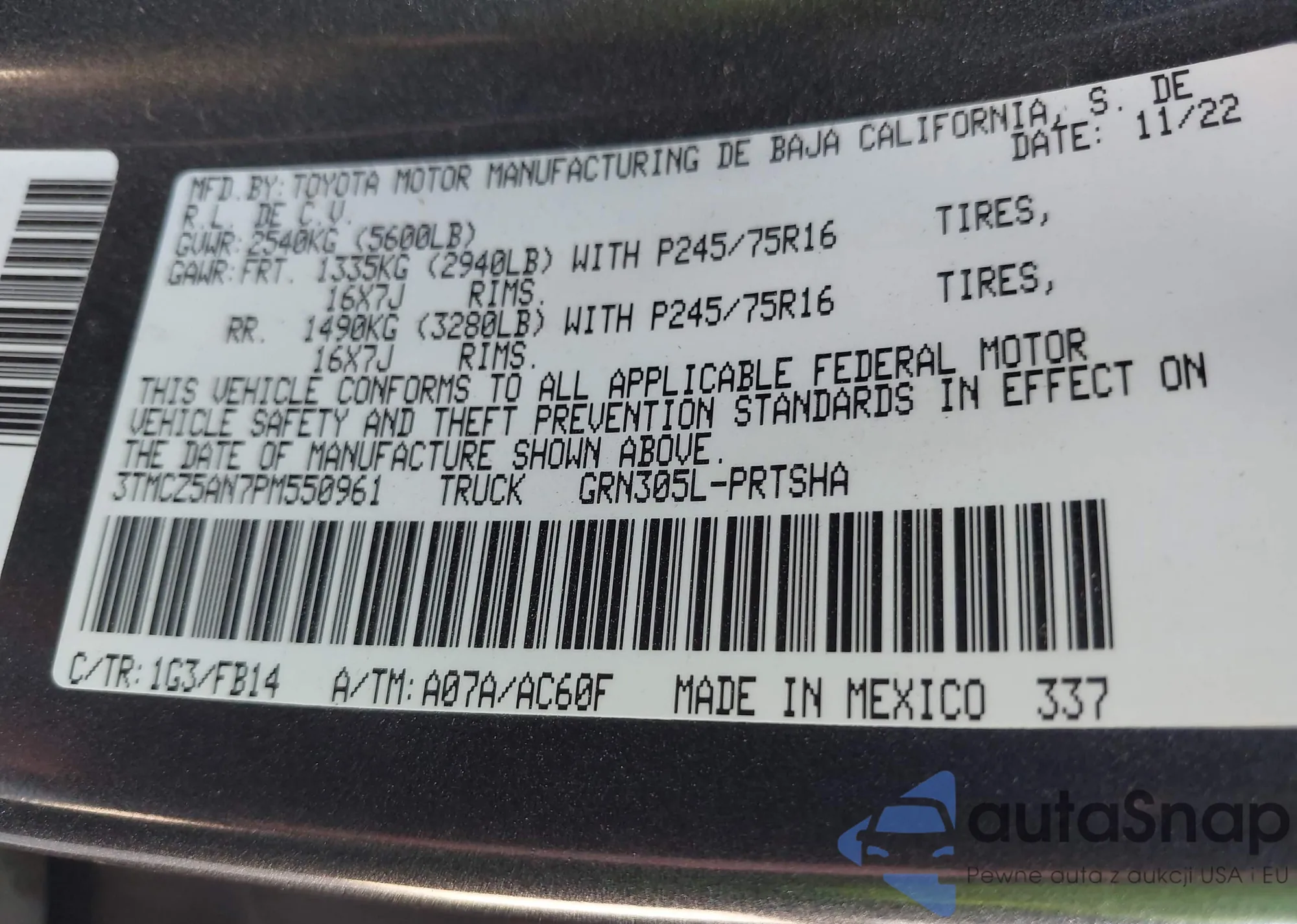 • VIN 3TMCZ5AN7PM550961