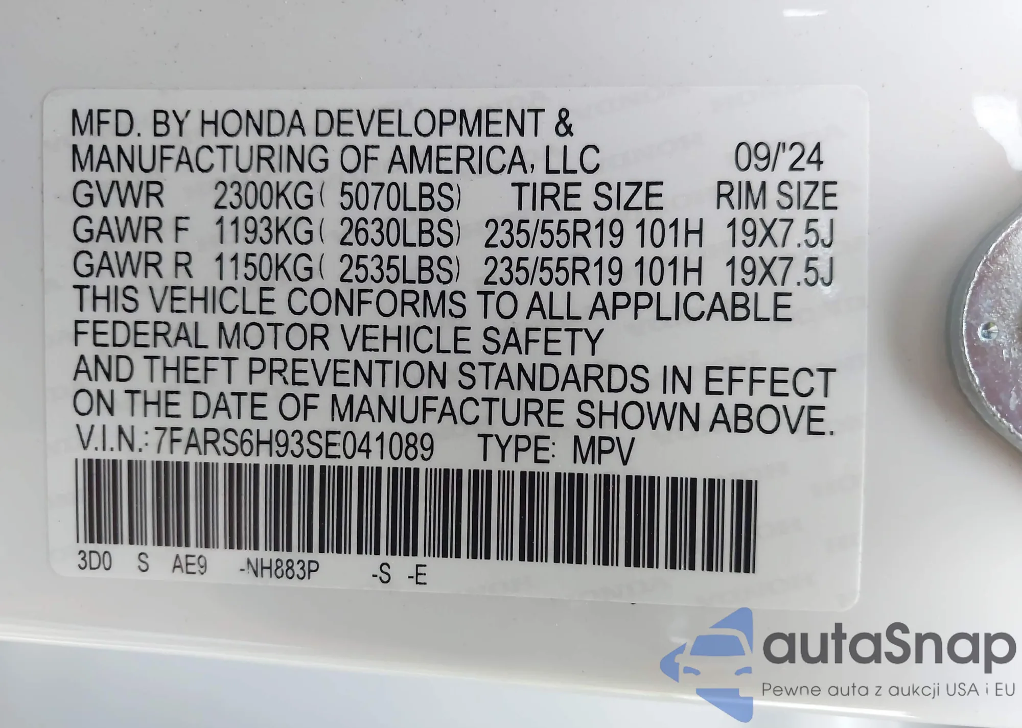 • VIN 7FARS6H93SE041089