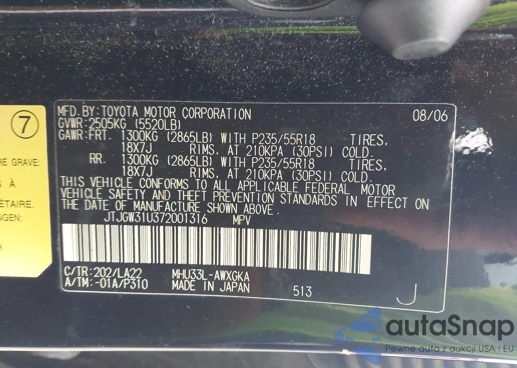 LOT: 43486495 VIN: JTJGW31U372001316