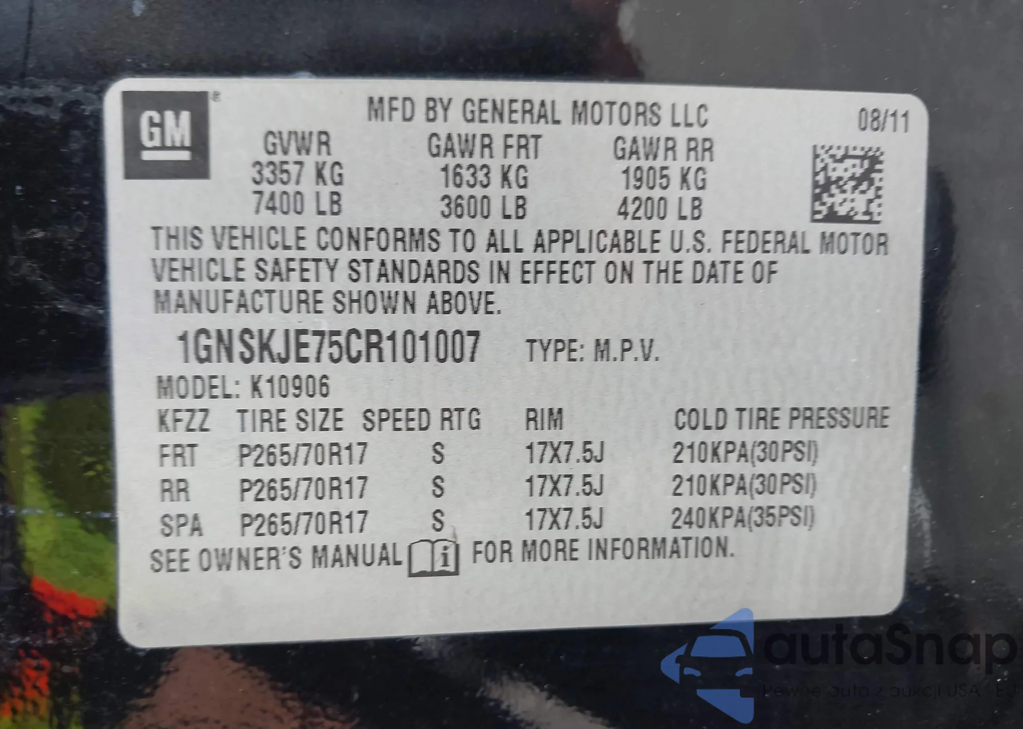 LOT: 42961553 VIN: 1GNSKJE75CR101007