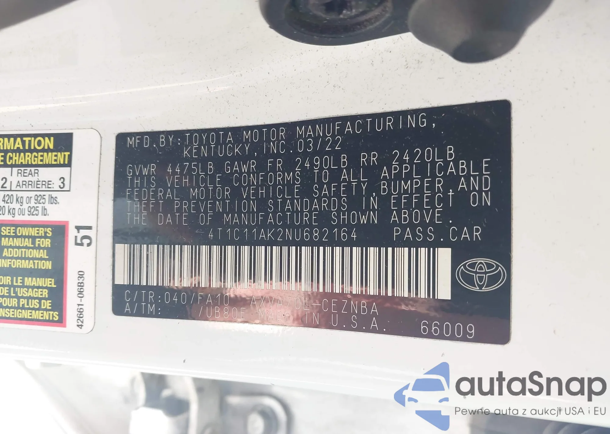 LOT: 43425336 VIN: 4T1C11AK2NU682164