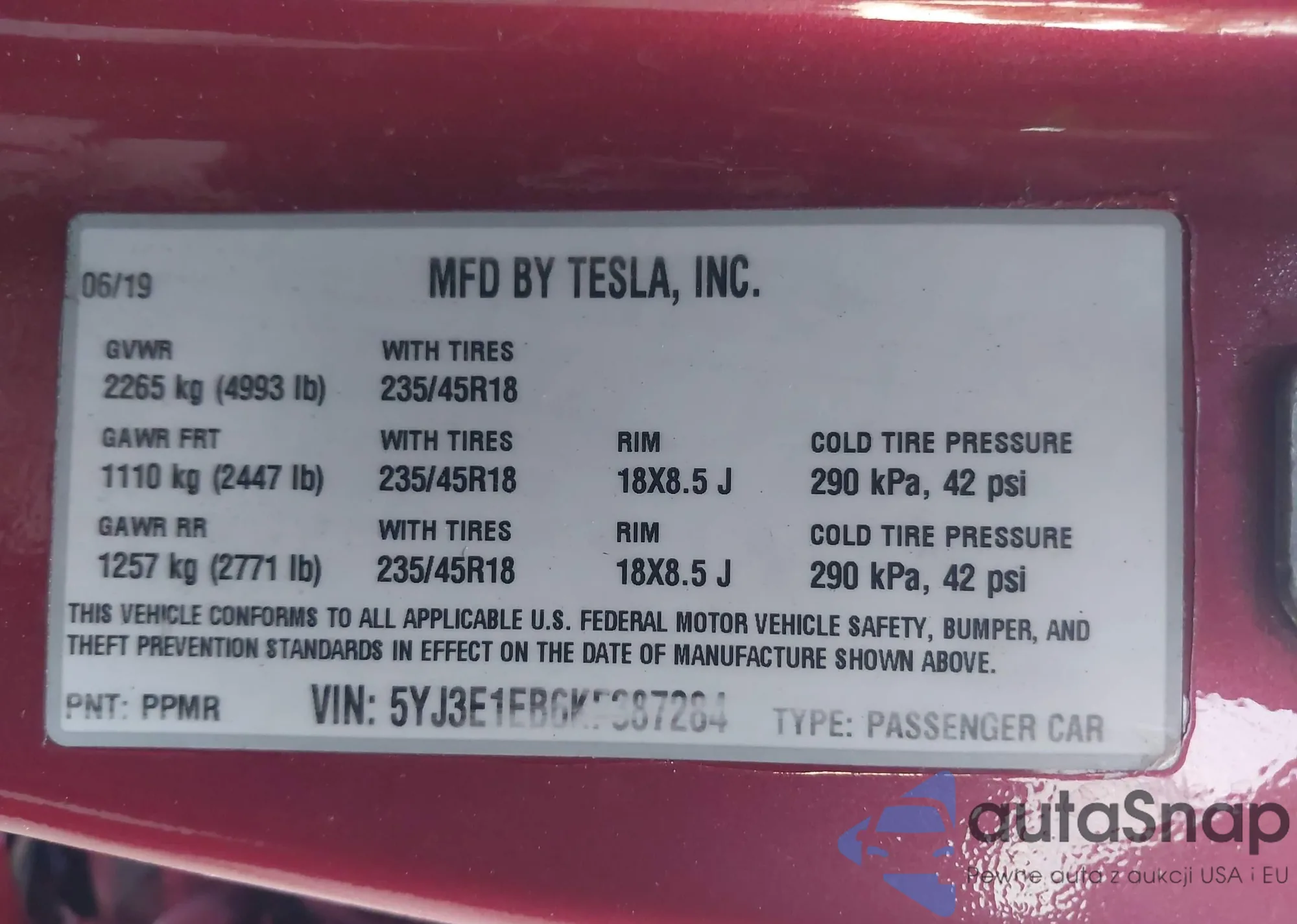 LOT: 43662439 VIN: 5YJ3E1EB6KF387284