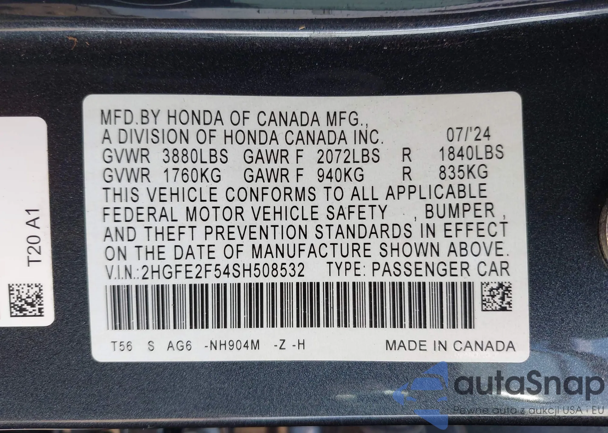 LOT: 43530438 VIN: 1HGCP36748A009712