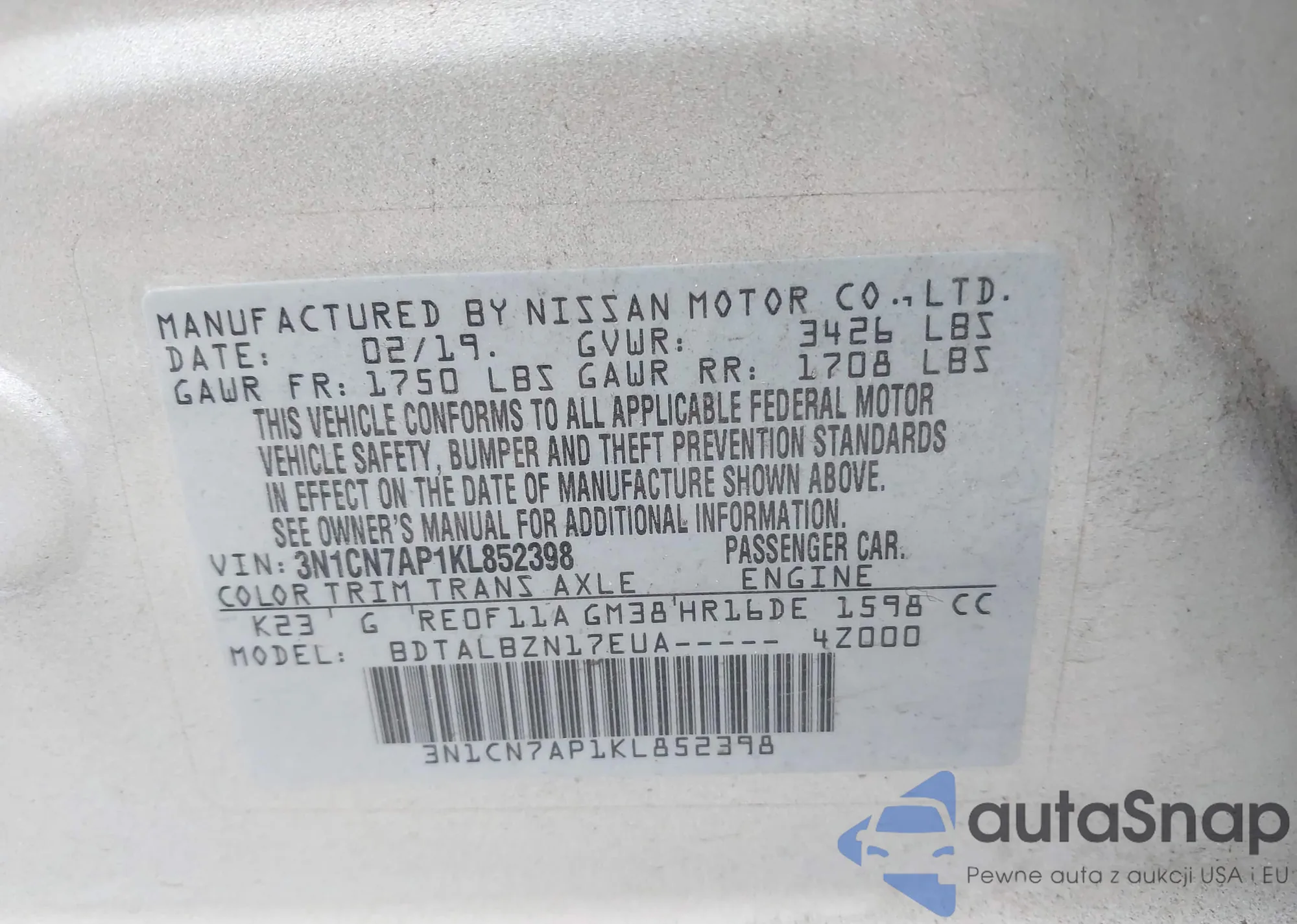 • VIN 3N1CN7AP1KL852398