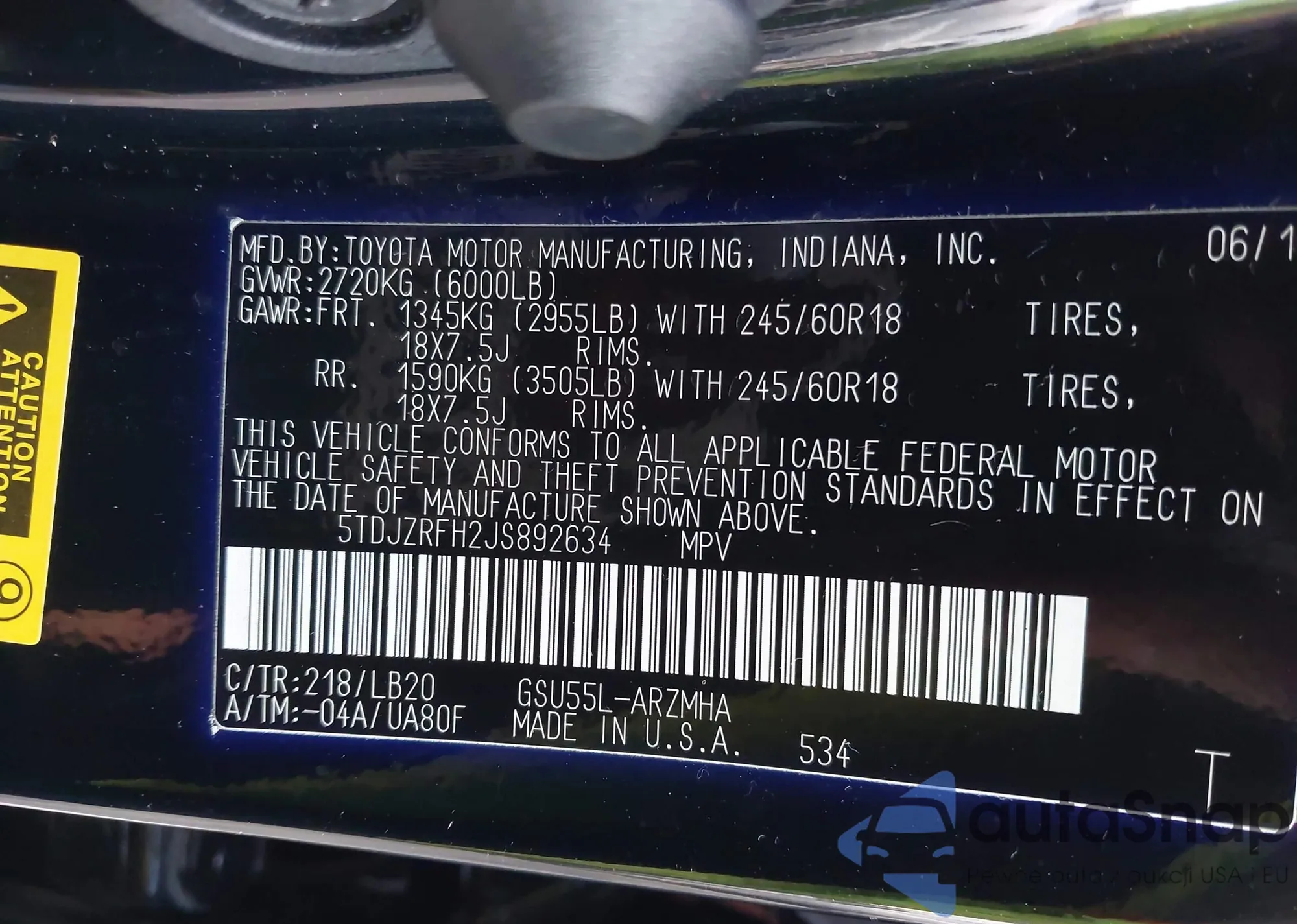 LOT: 43307394 VIN: 5TDJZRFH2JS892634