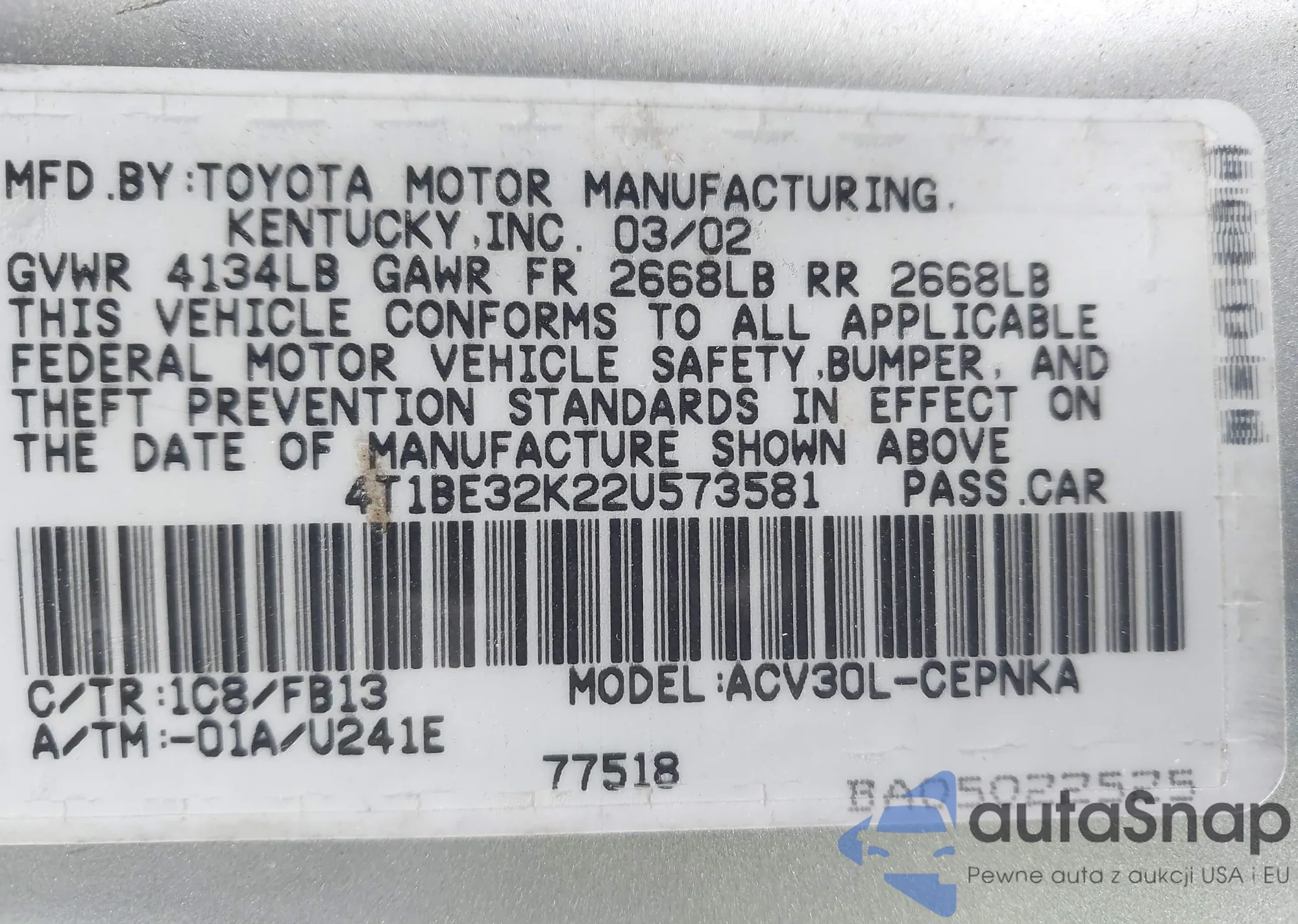 • VIN 4T1BE32K22U573581