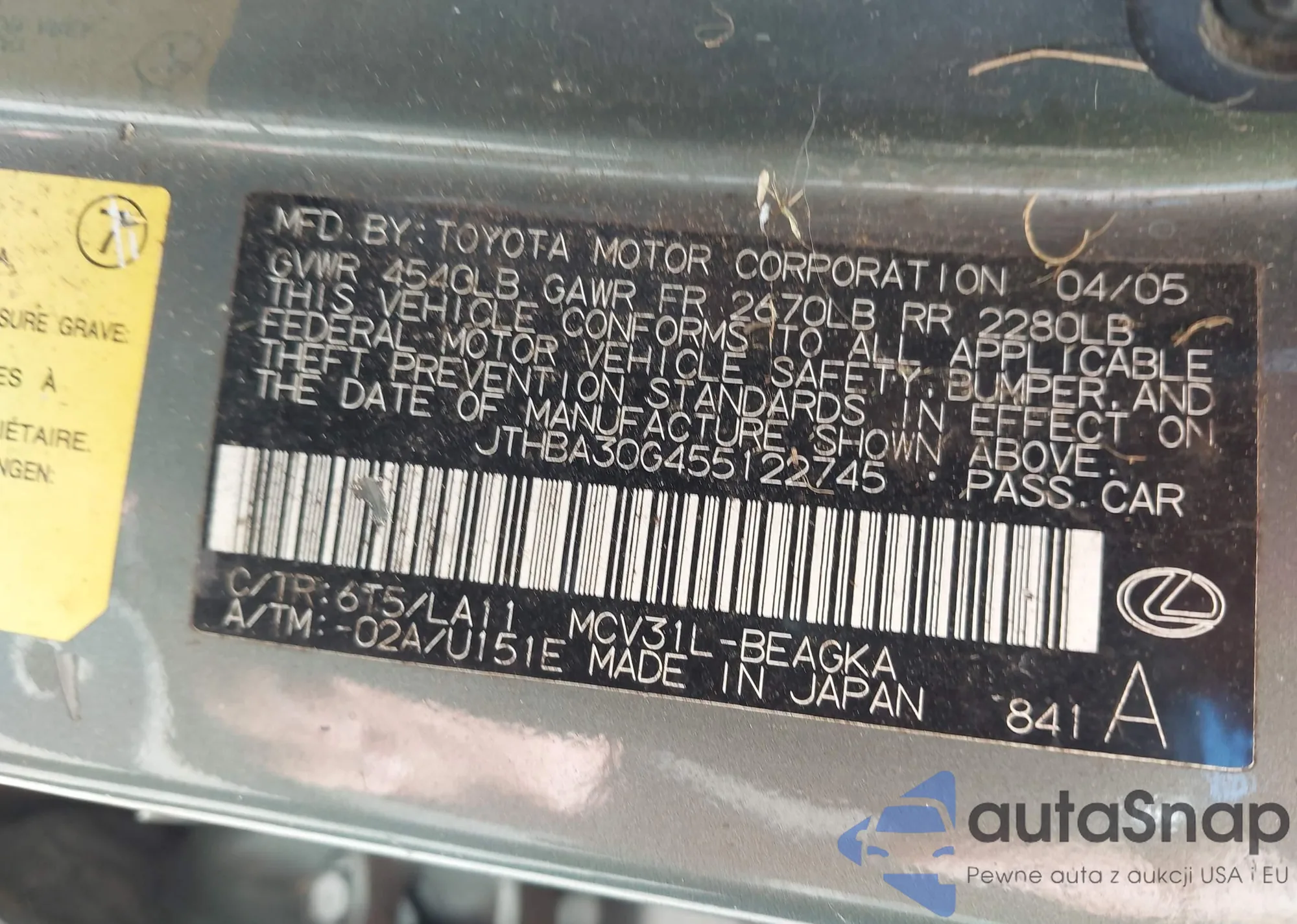 LOT: 43611695 VIN: JTHBA30G455122745