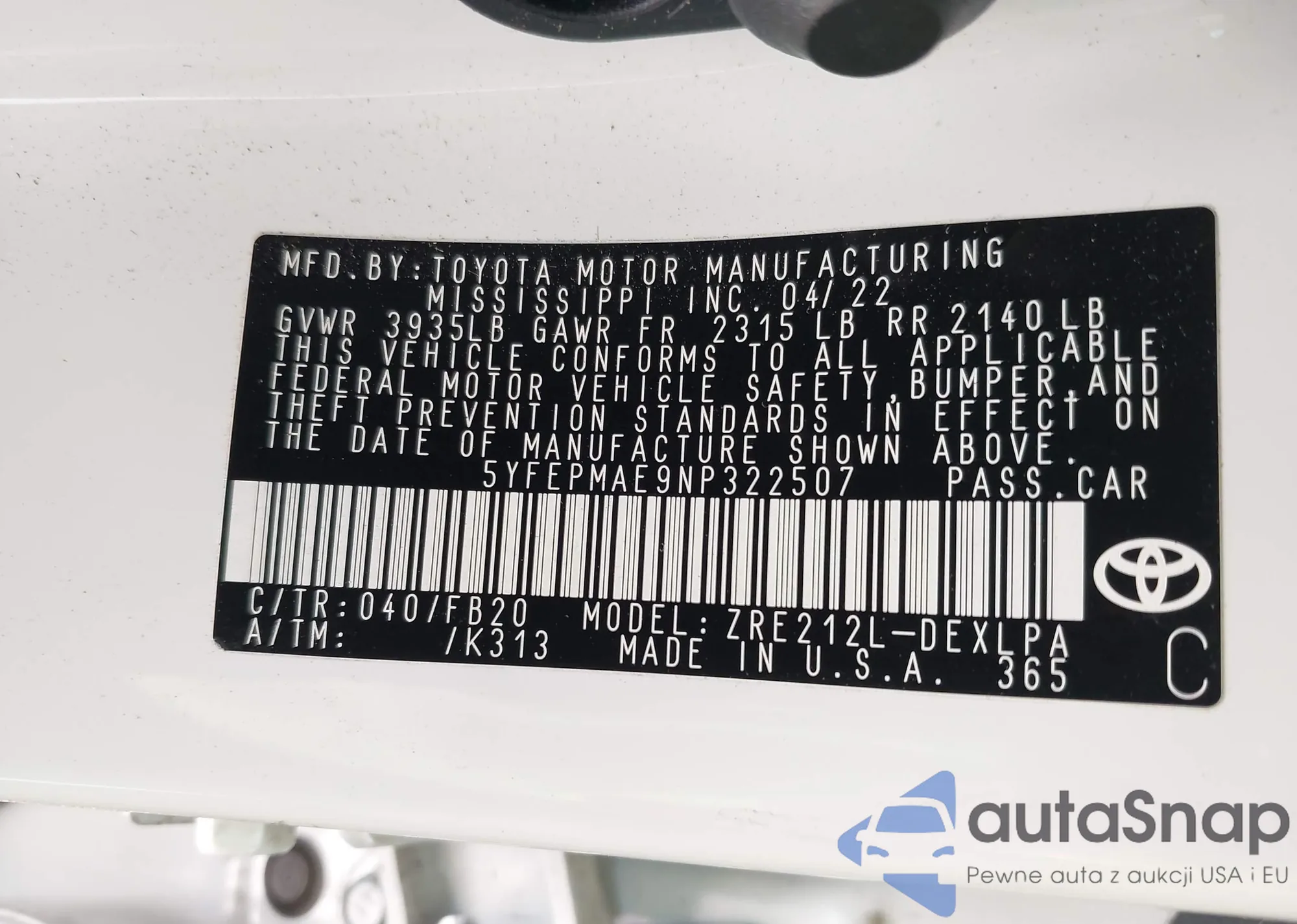 LOT: 43726422 VIN: 4T1DAACK2SU009145