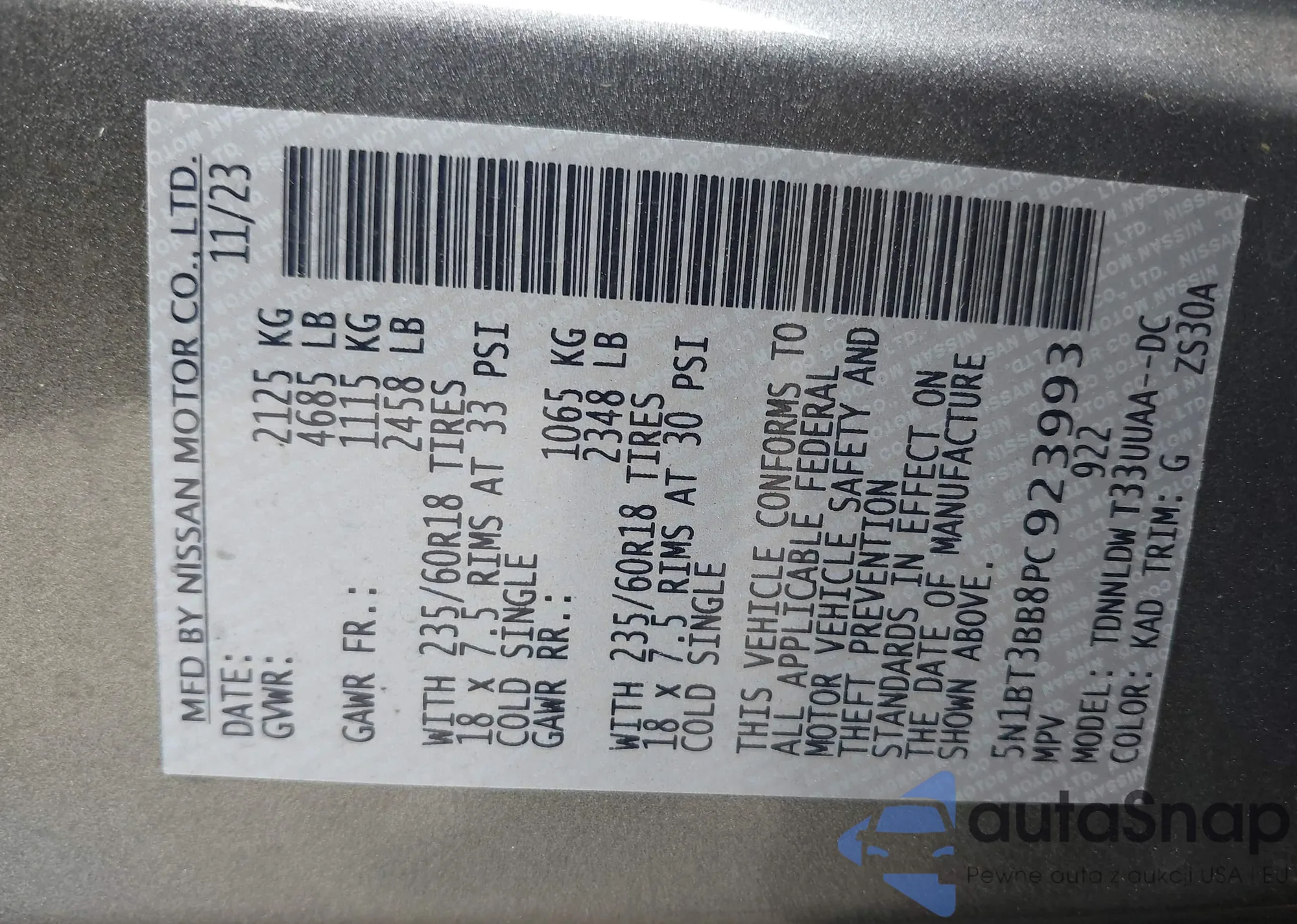 LOT: 43192287 VIN: 5N1BT3BB8PC923993