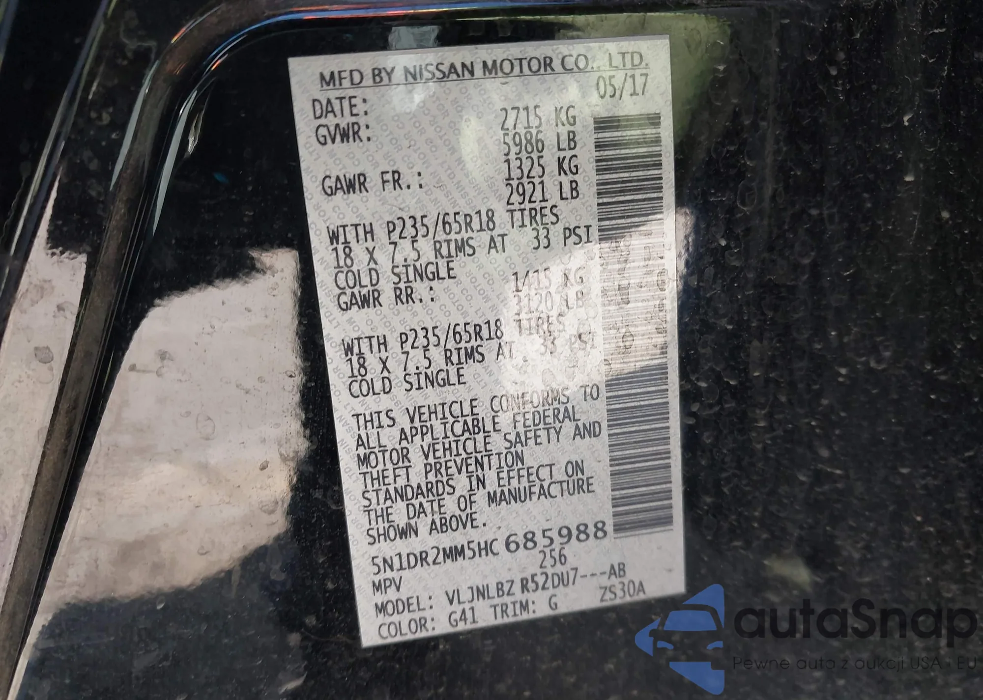 LOT: 43472111 VIN: 5N1DR2MM5HC685988
