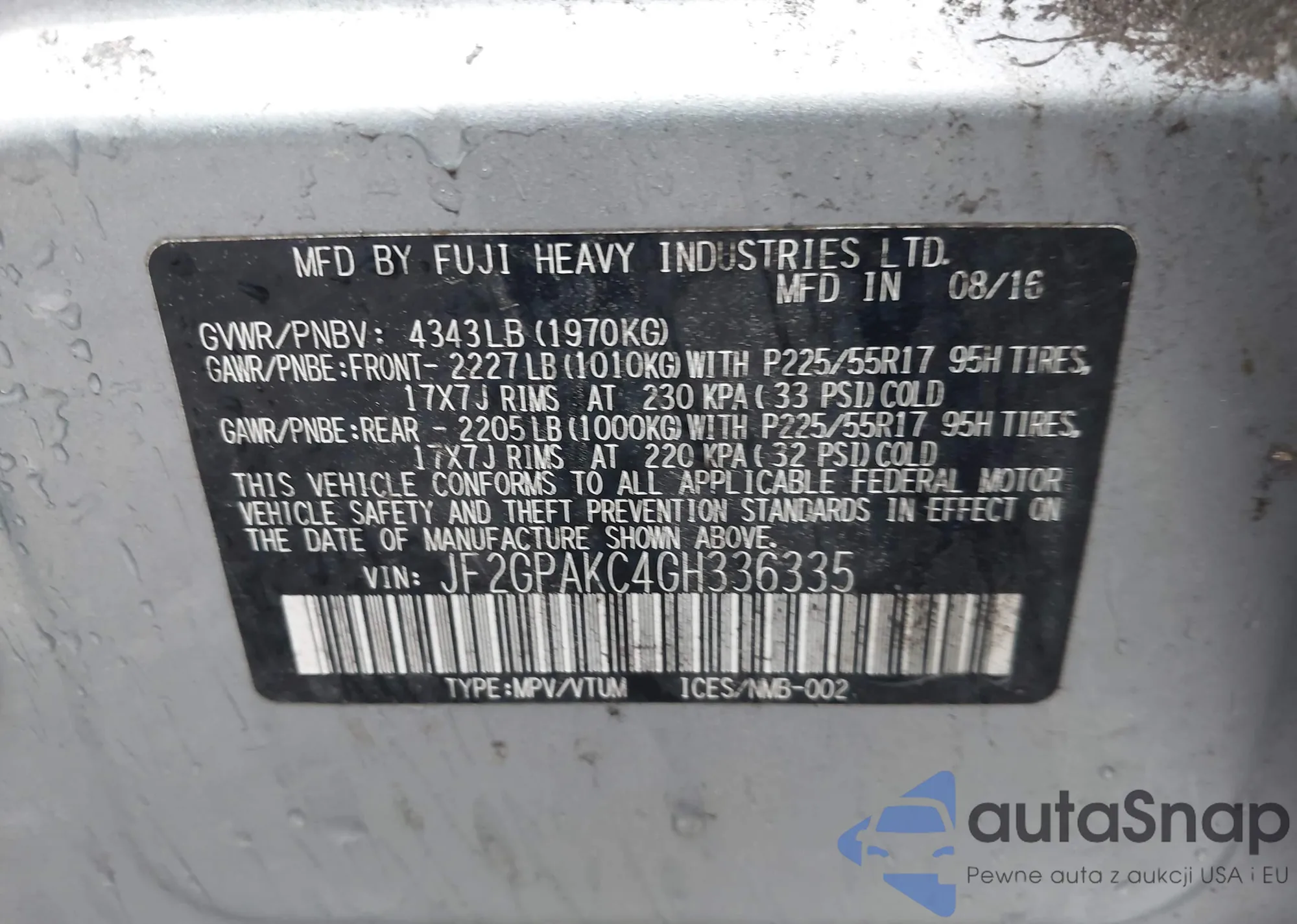 LOT: 43297692 VIN: JF2GPAKC4GH336335