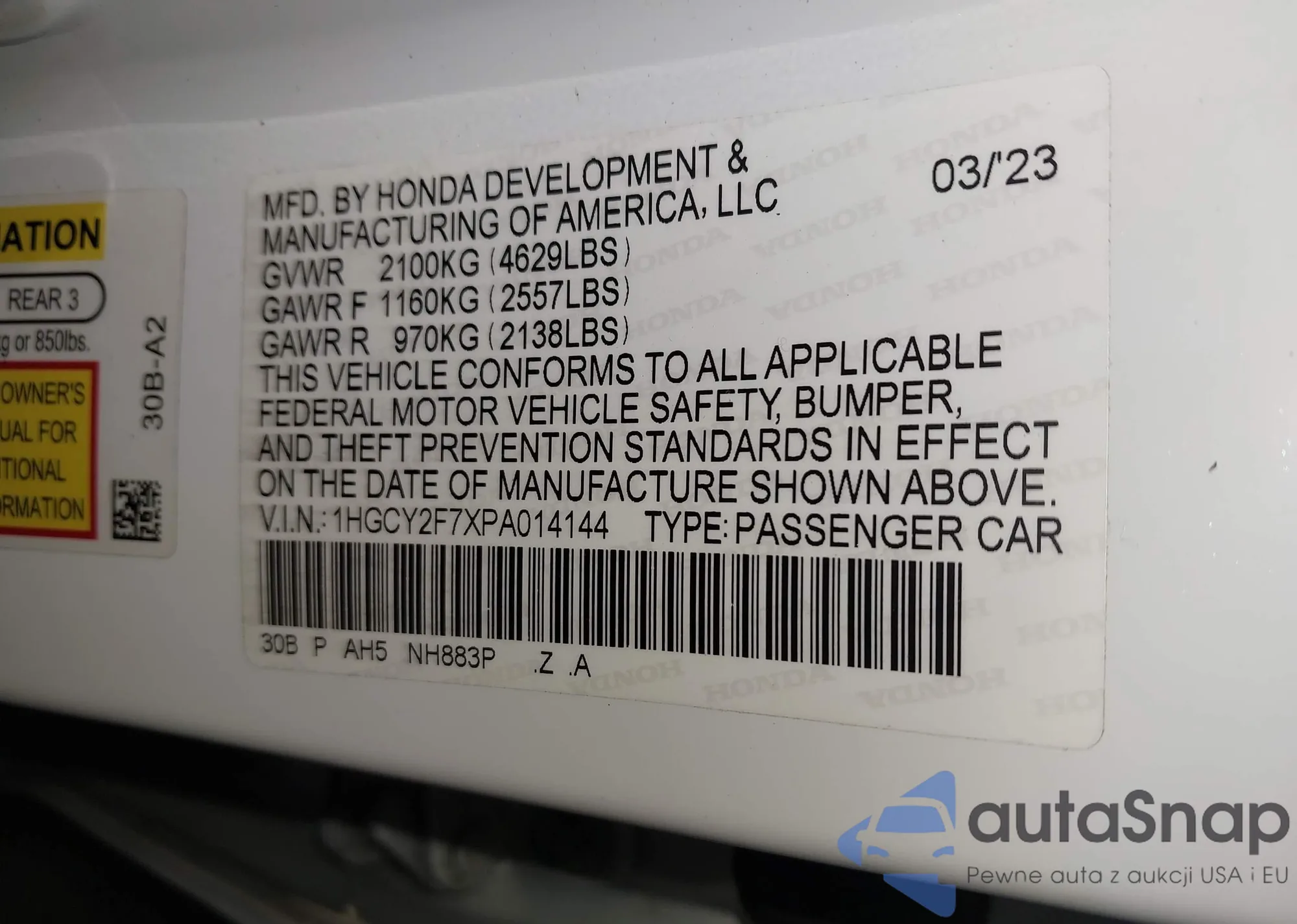 LOT: 43460437 VIN: 1HGCY2F7XPA014144
