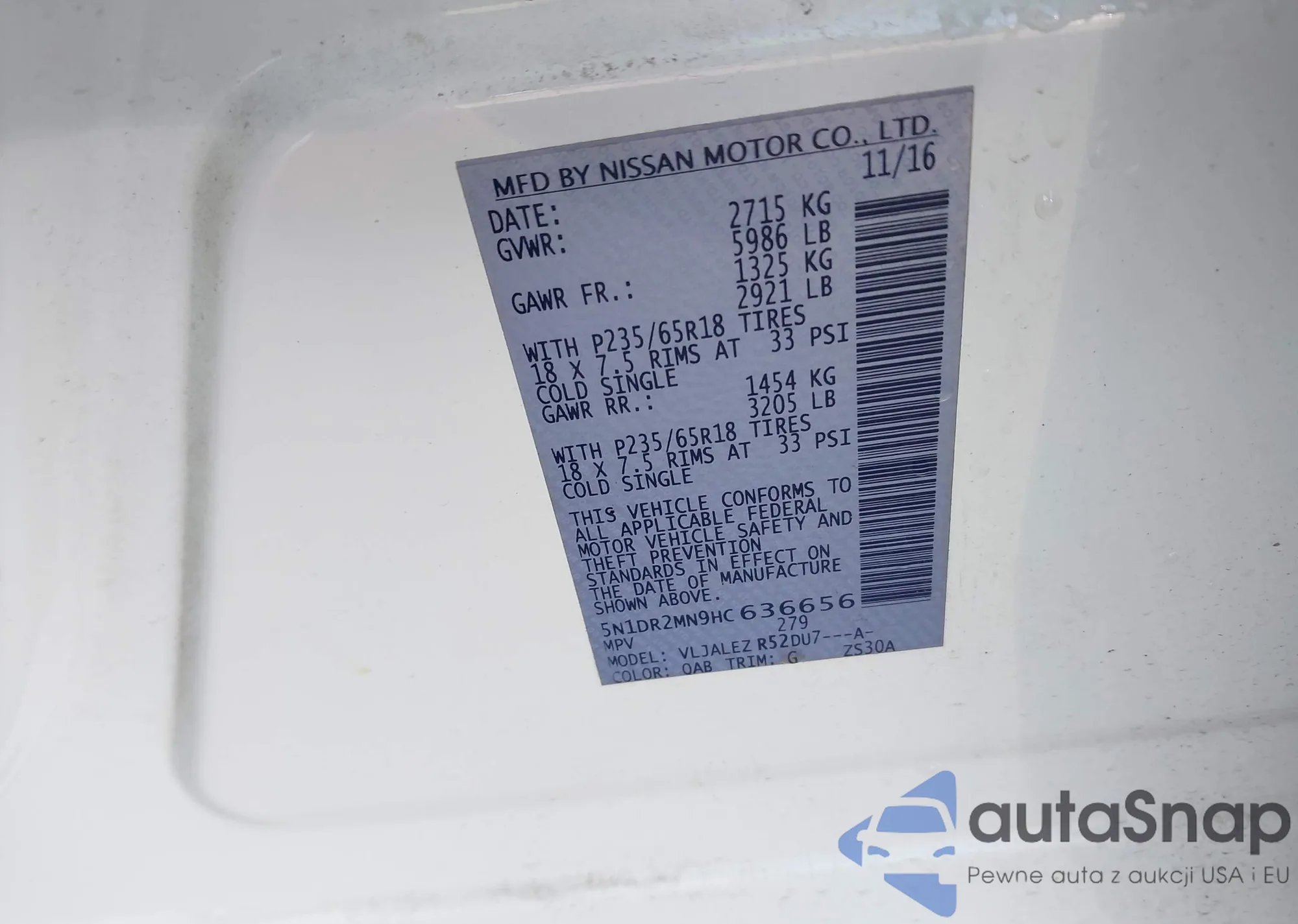 LOT: 43414754 VIN: 5N1DR2MN9HC636656