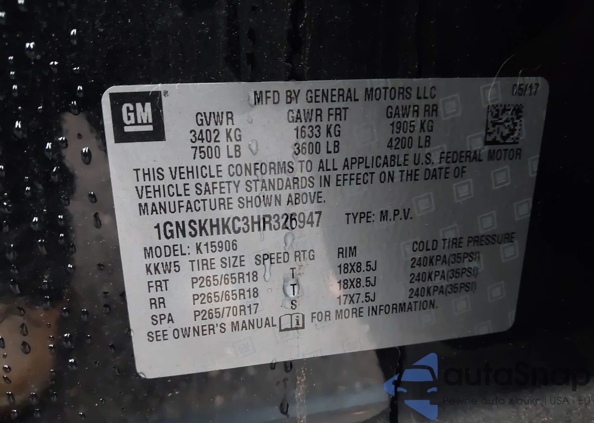 LOT: 43727464 VIN: 1GNSKHKC3HR326947
