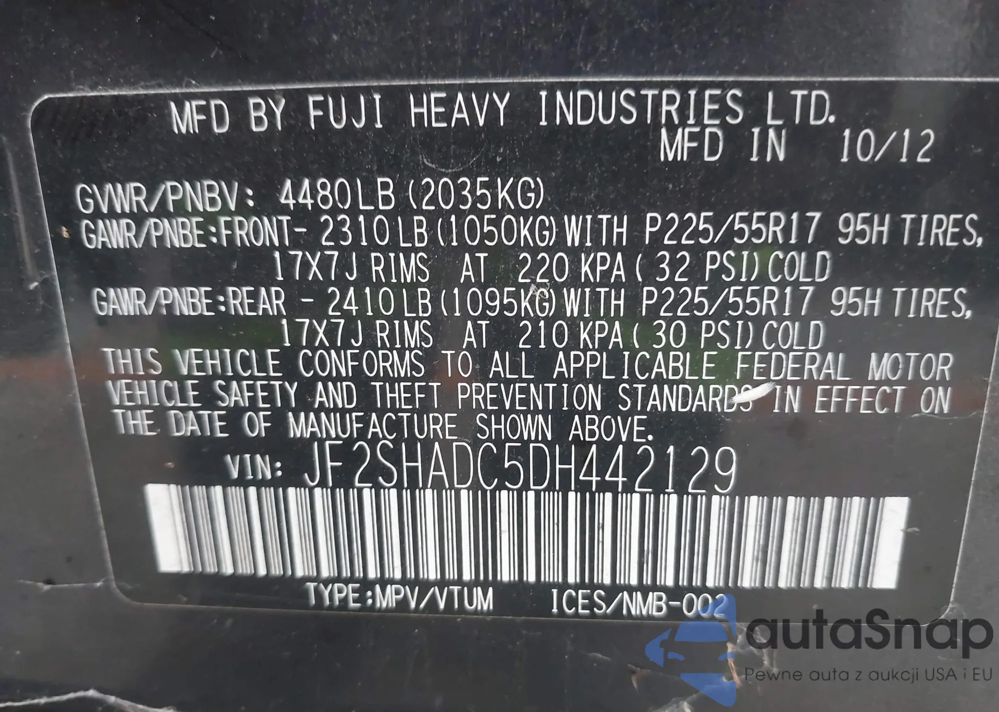 LOT: 43751546 VIN: JF2SHADC5DH442129