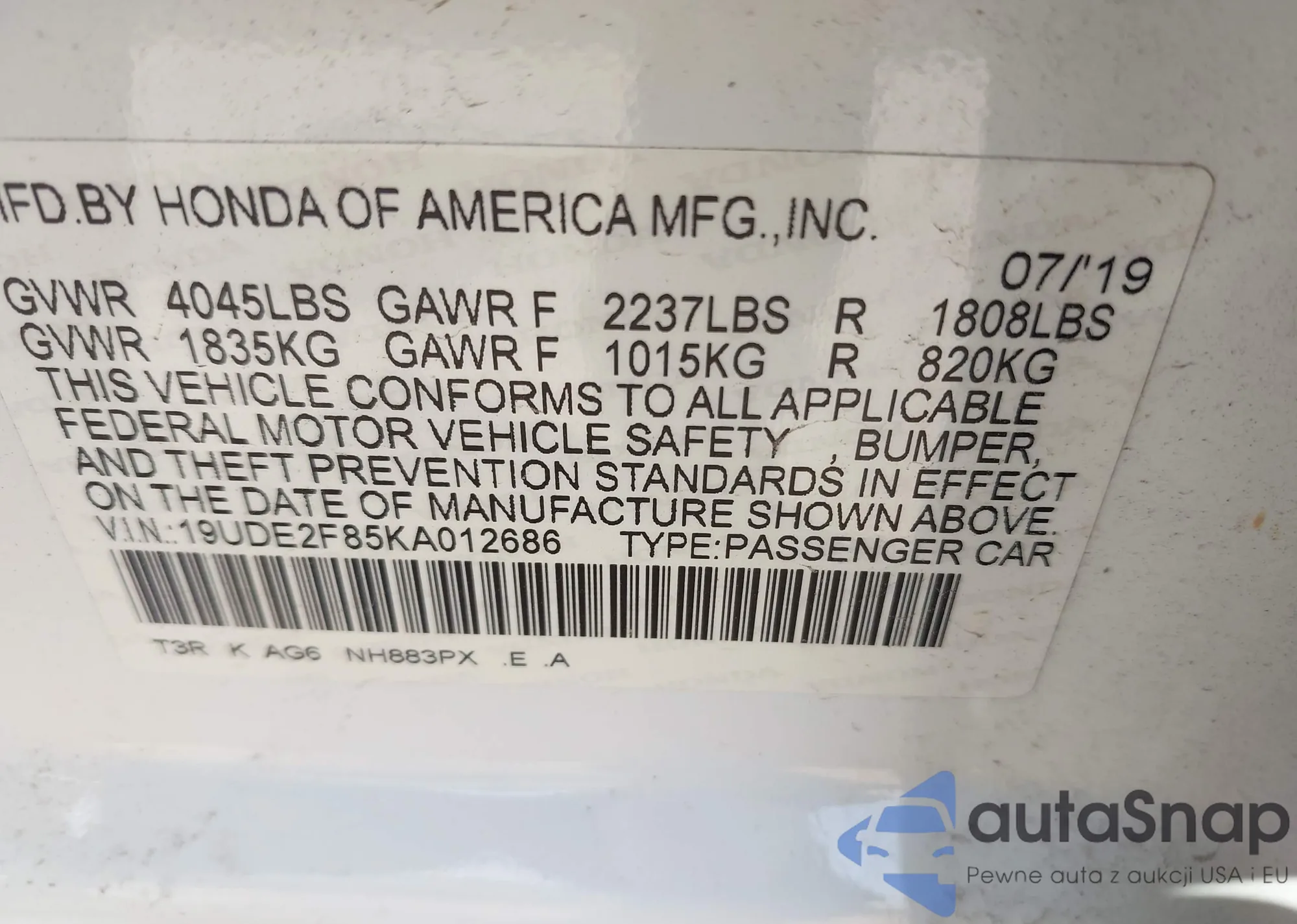 LOT: 43351243 VIN: 19UDE2F85KA012686