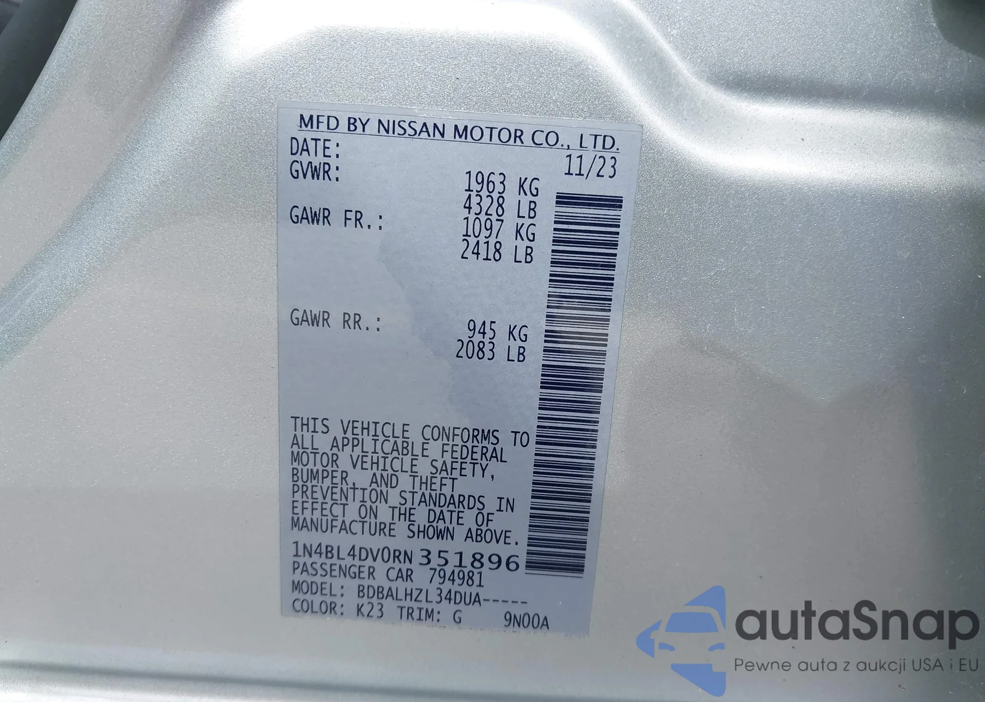 LOT: 43609920 VIN: 1N4BL4CV7PN384702