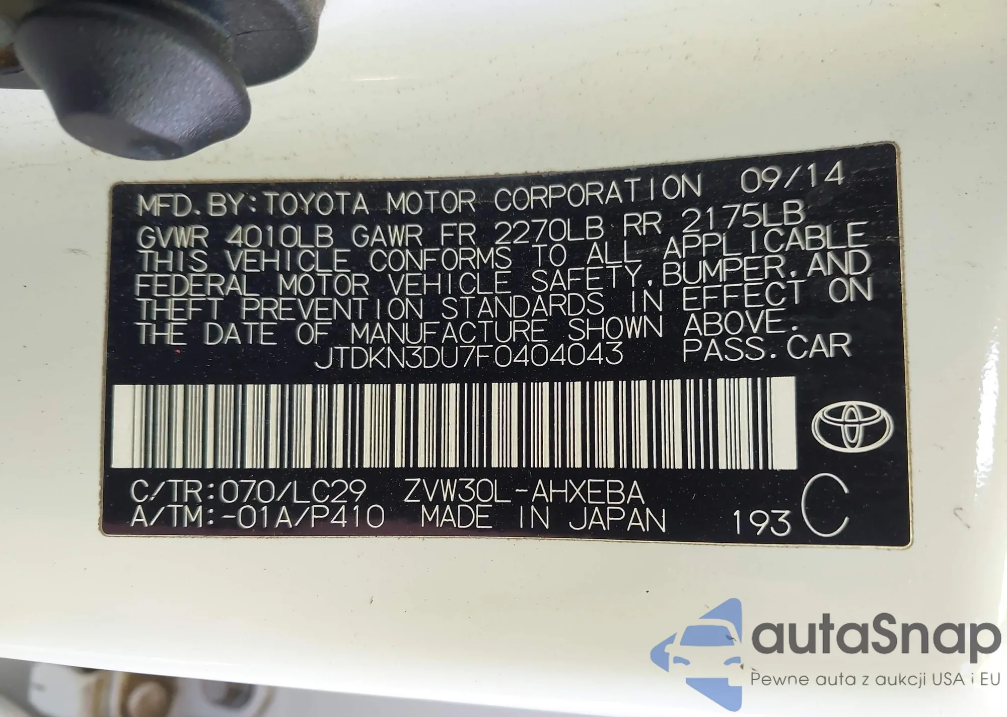 LOT: 43630837 VIN: JTDKN3DU7F0404043