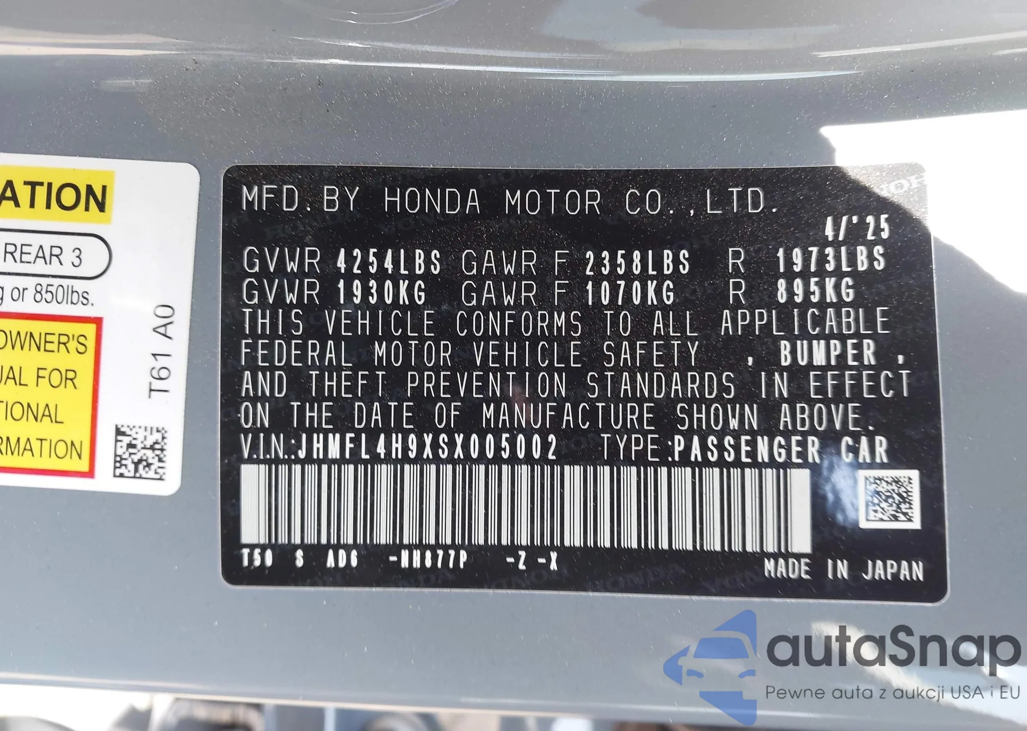LOT: 43344960 VIN: JHMFL4H9XSX005002