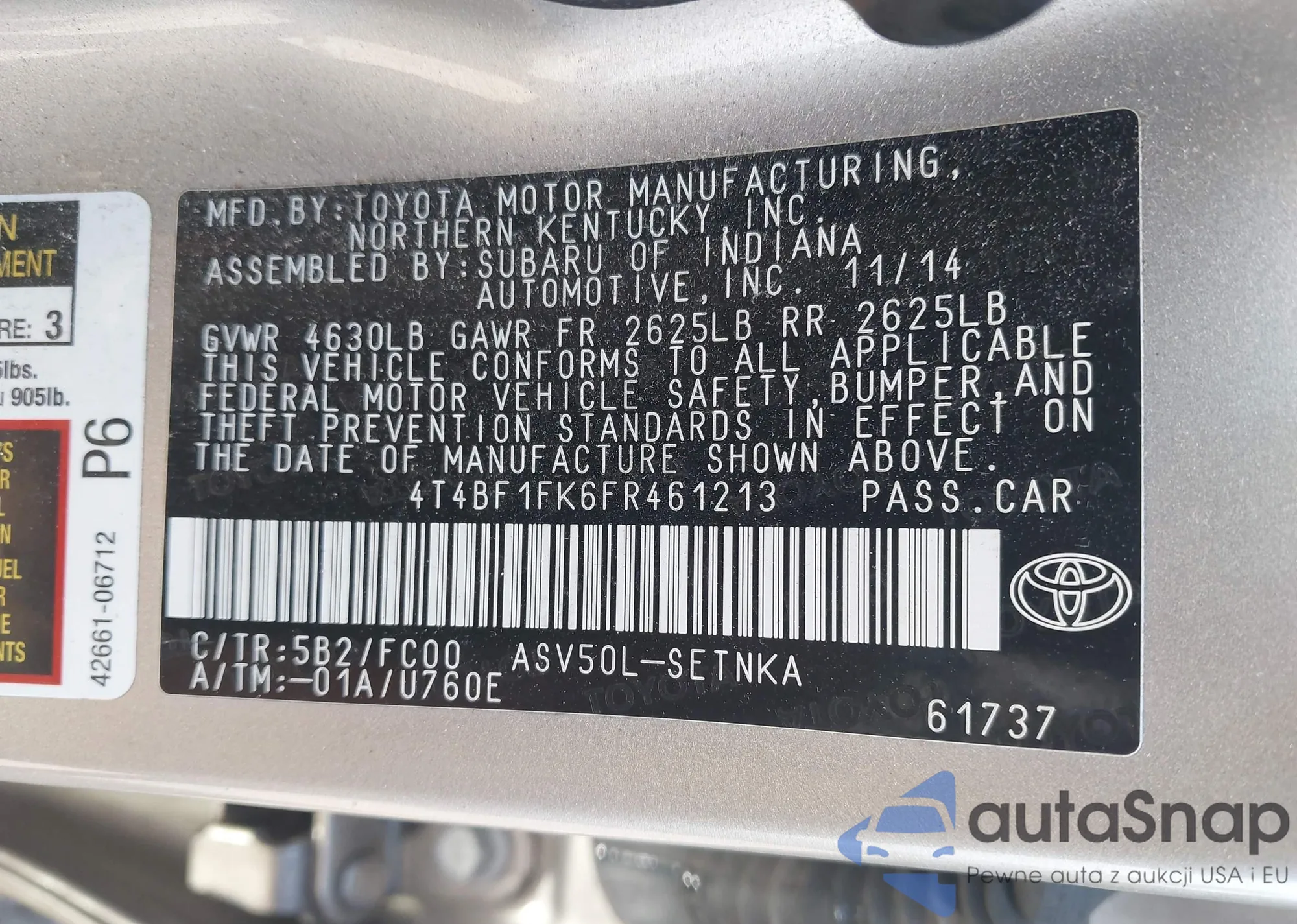 • VIN 4T4BF1FK6FR461213