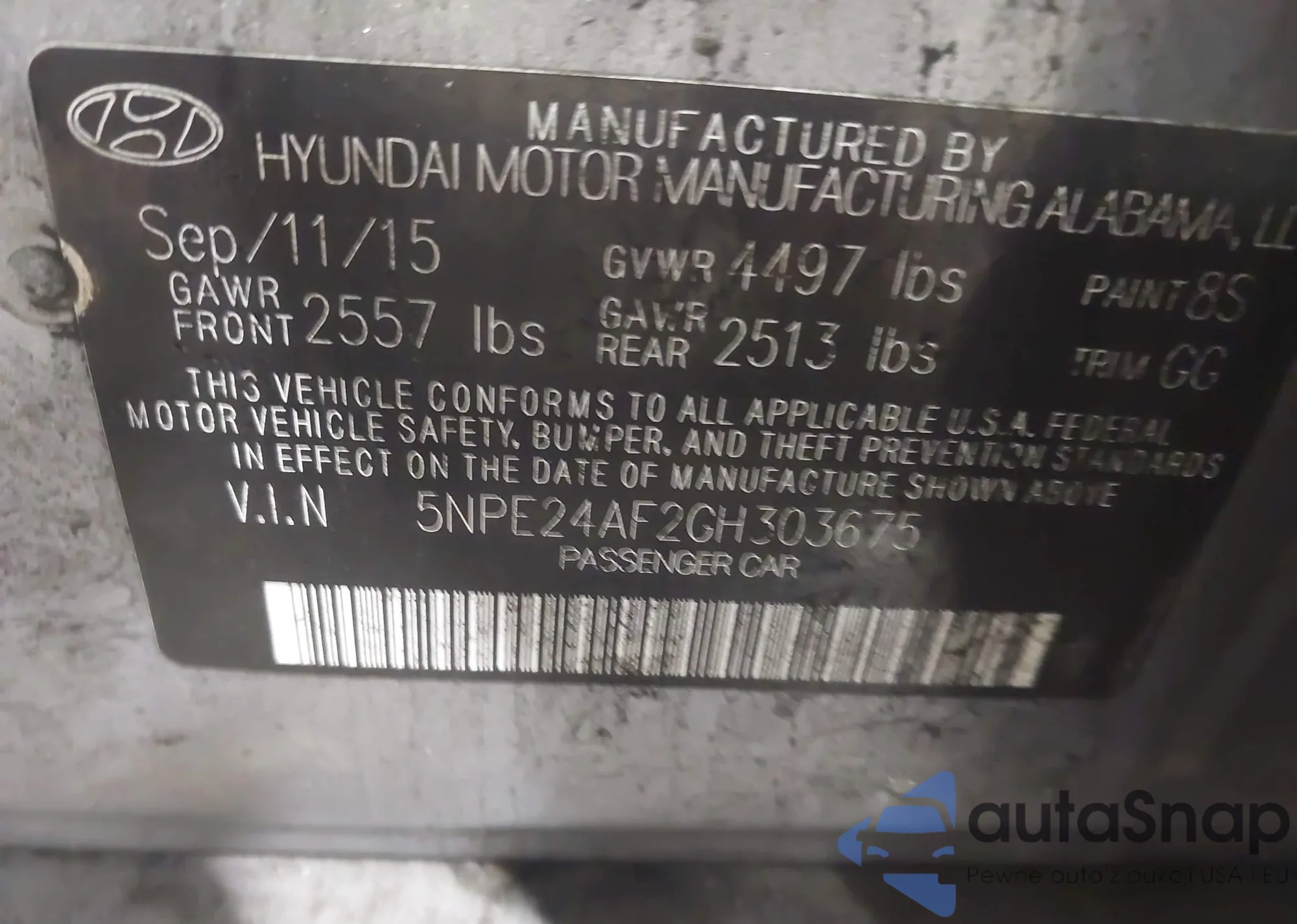 • VIN 5NPE24AF2GH303675
