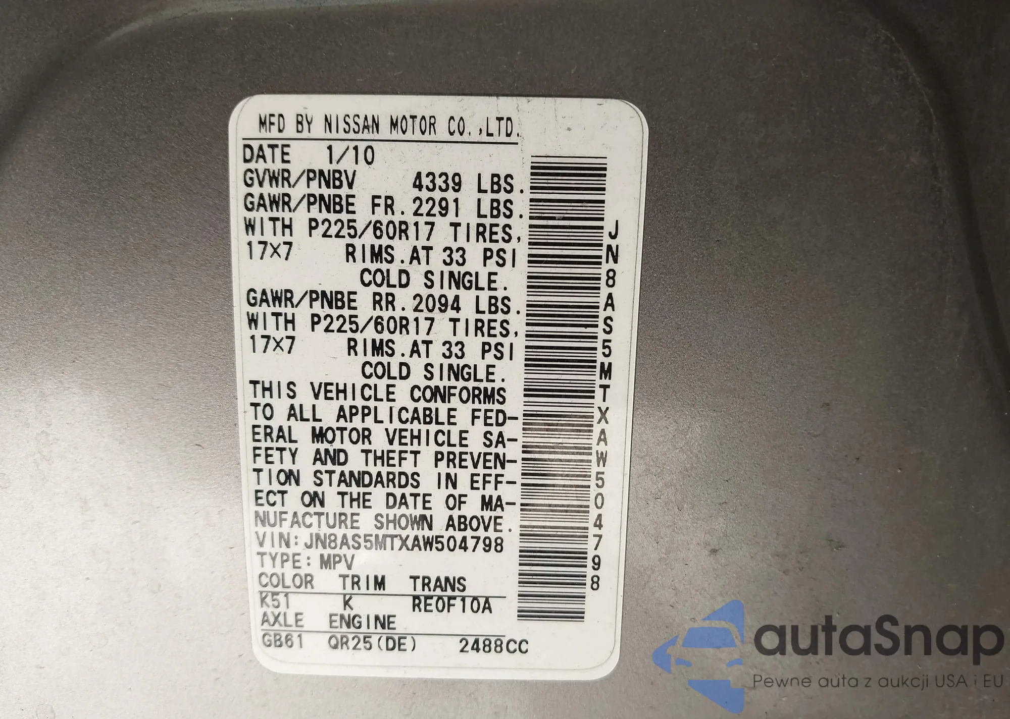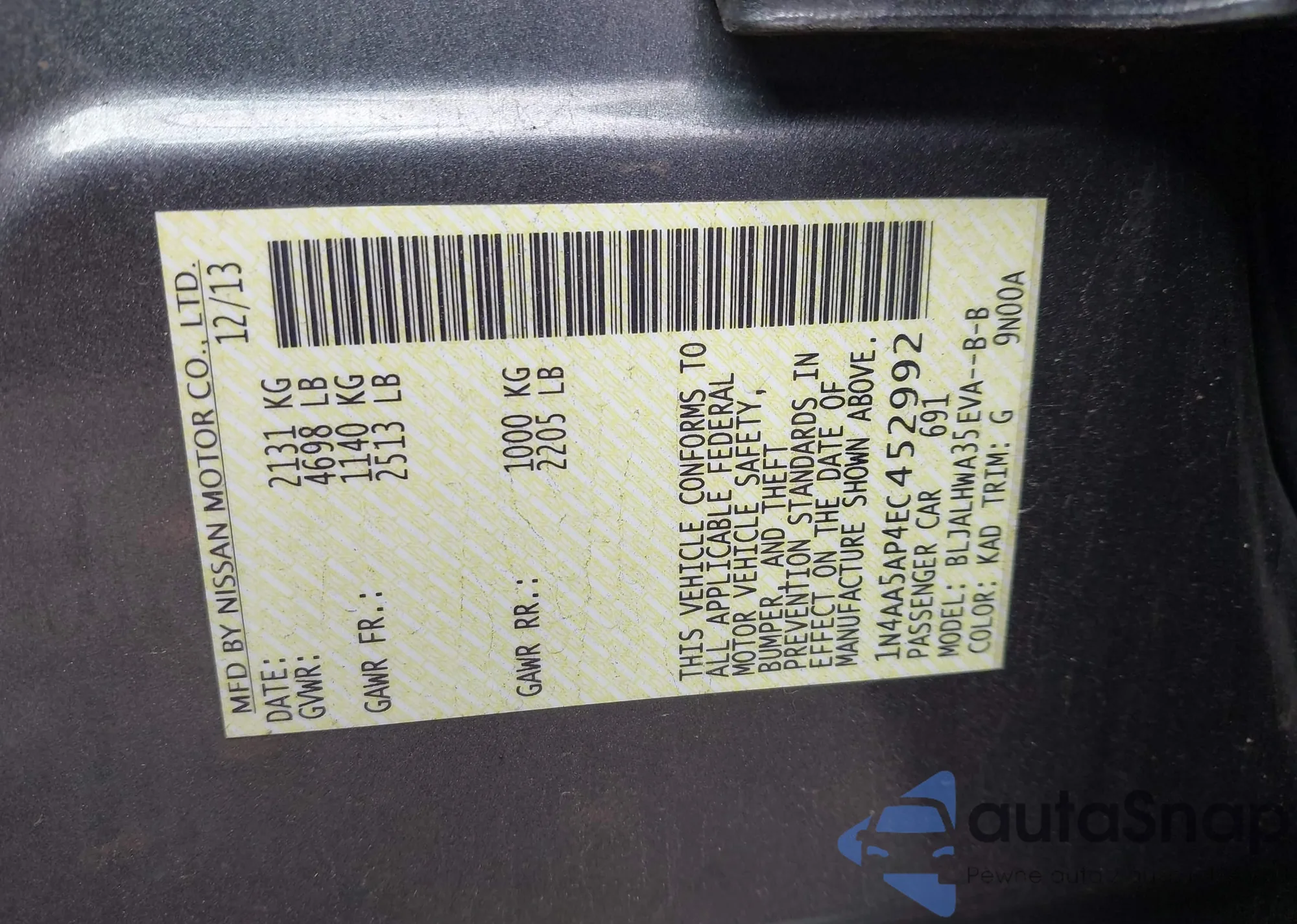 • VIN 1N4AA5AP4EC452992