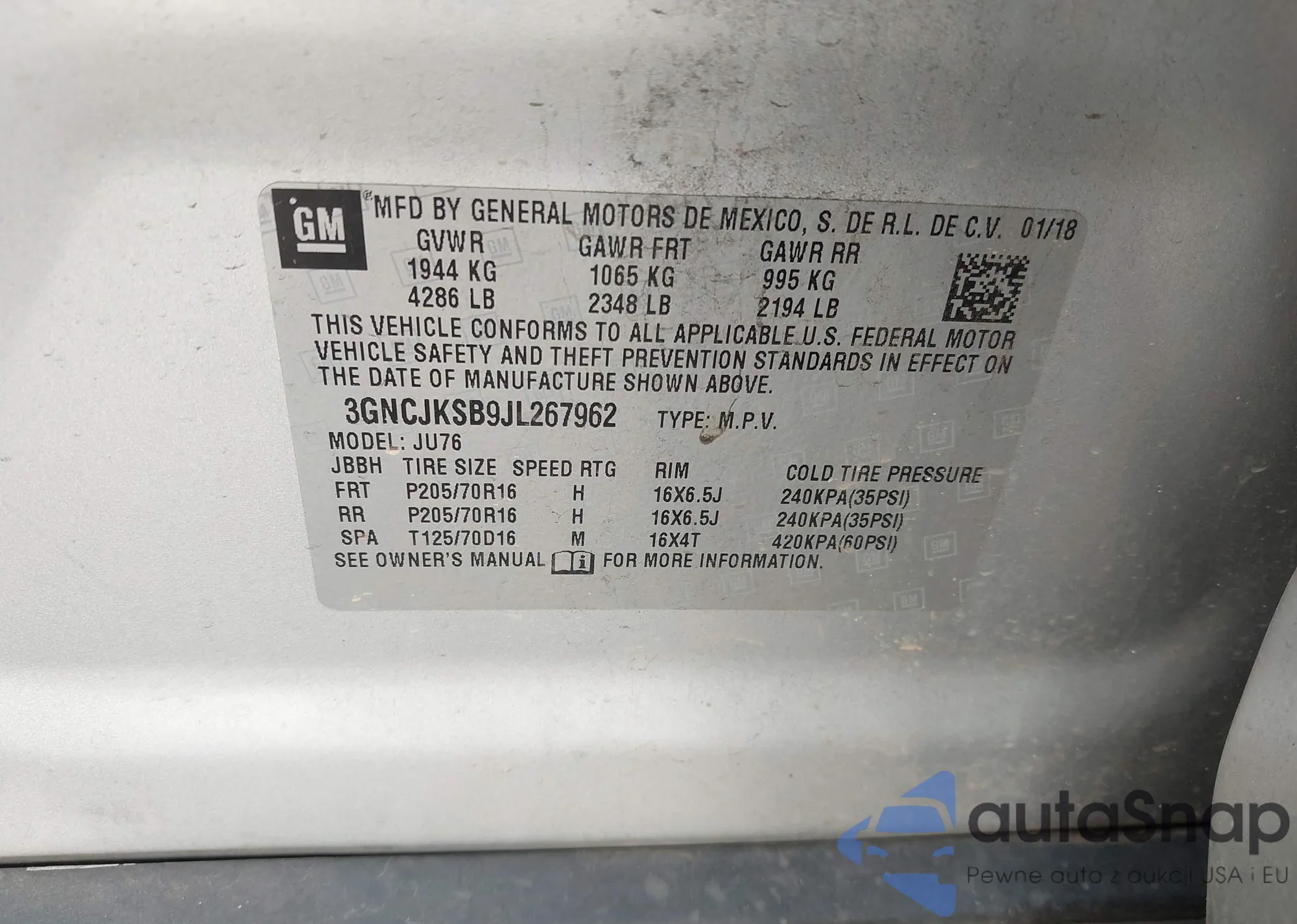 • VIN 3GNCJKSB9JL267962