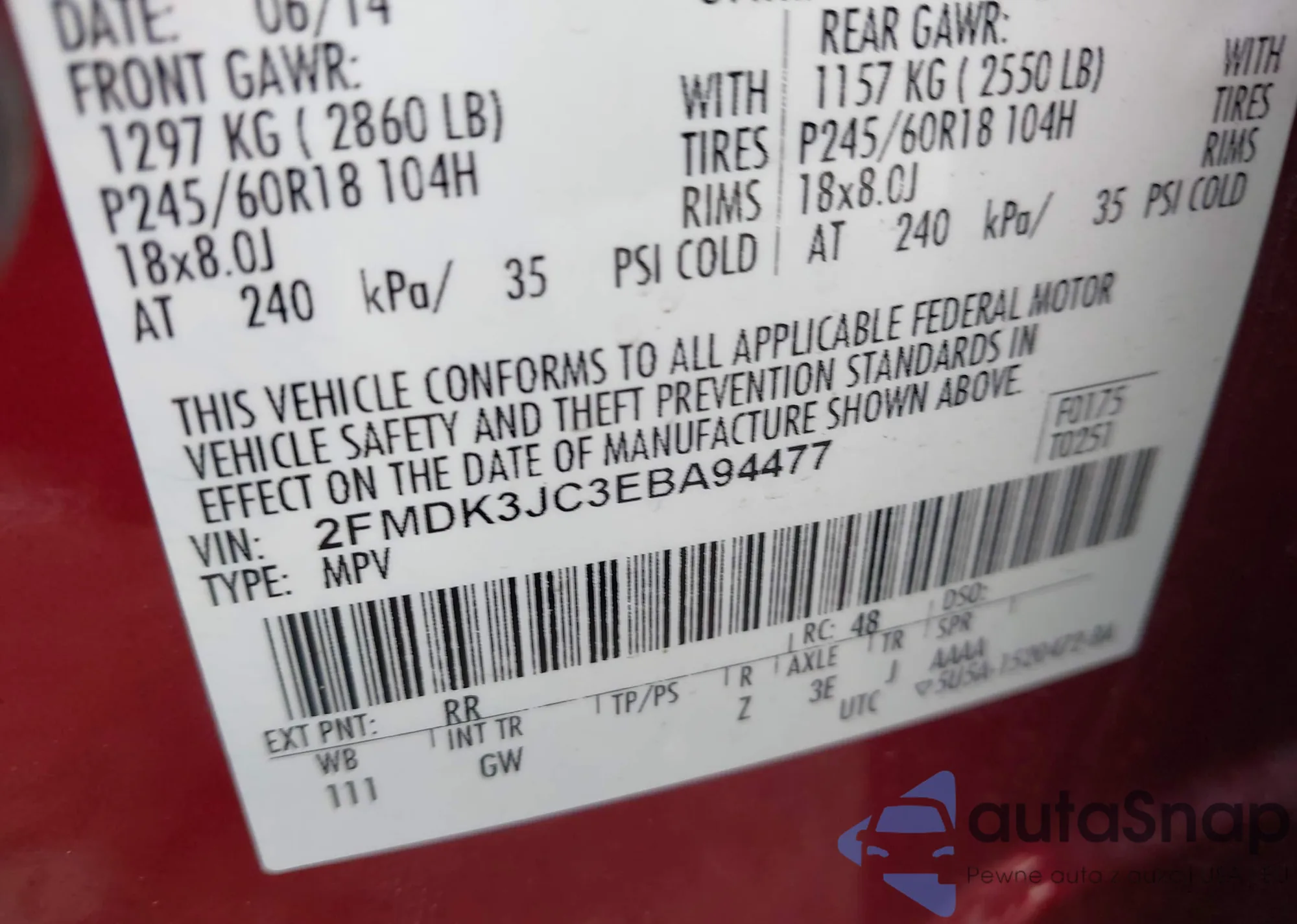 LOT: 43303067 VIN: 2FMDK3JC3EBA94477