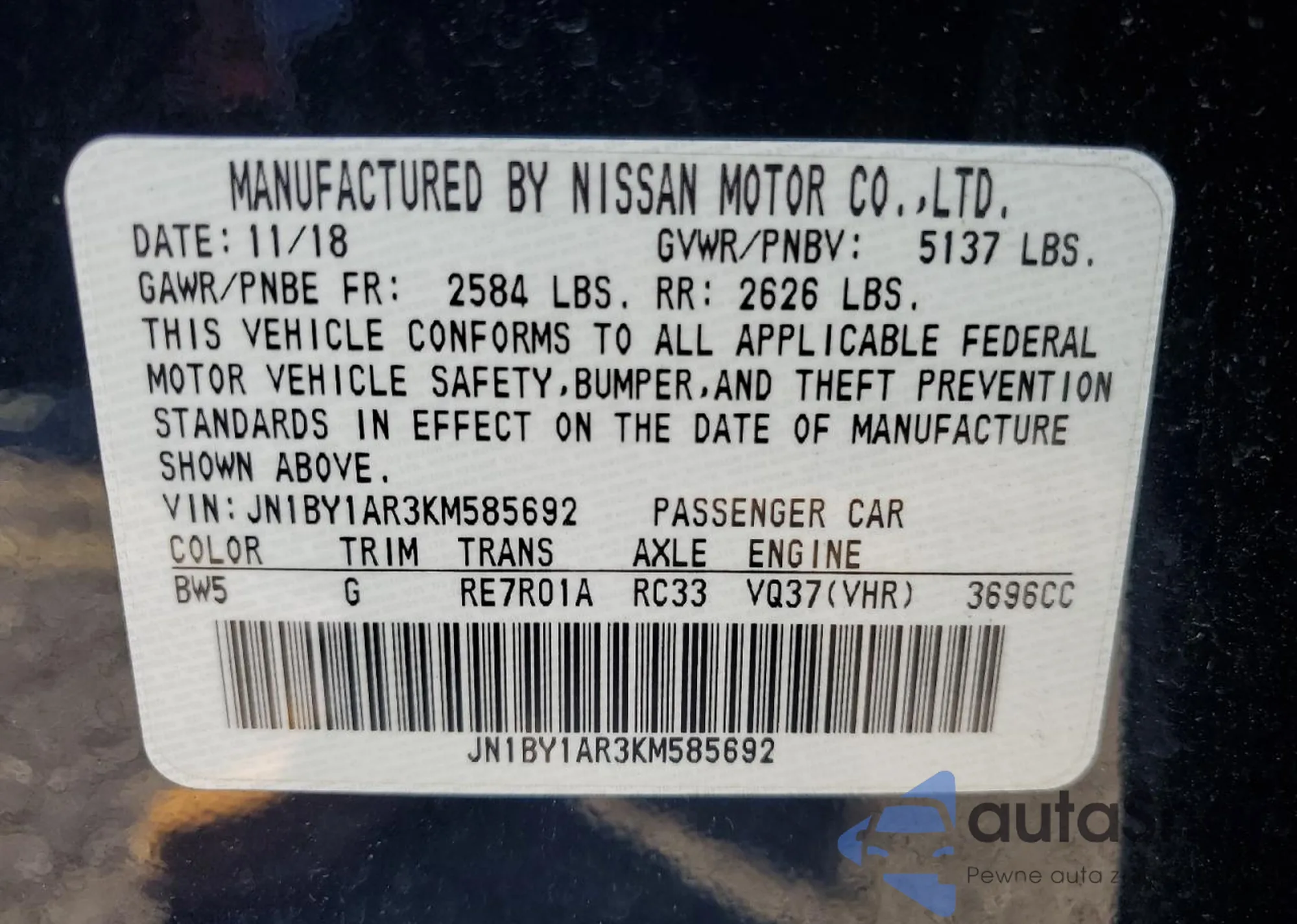 LOT: 91356735 VIN: JN1BY1AR3KM585692