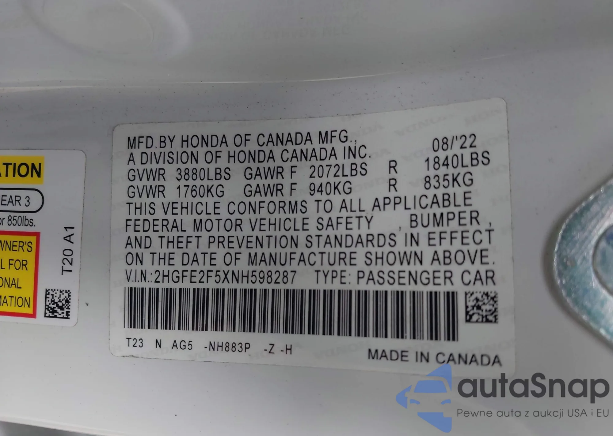 LOT: 43257627 VIN: 2HGFE2F5XNH598287