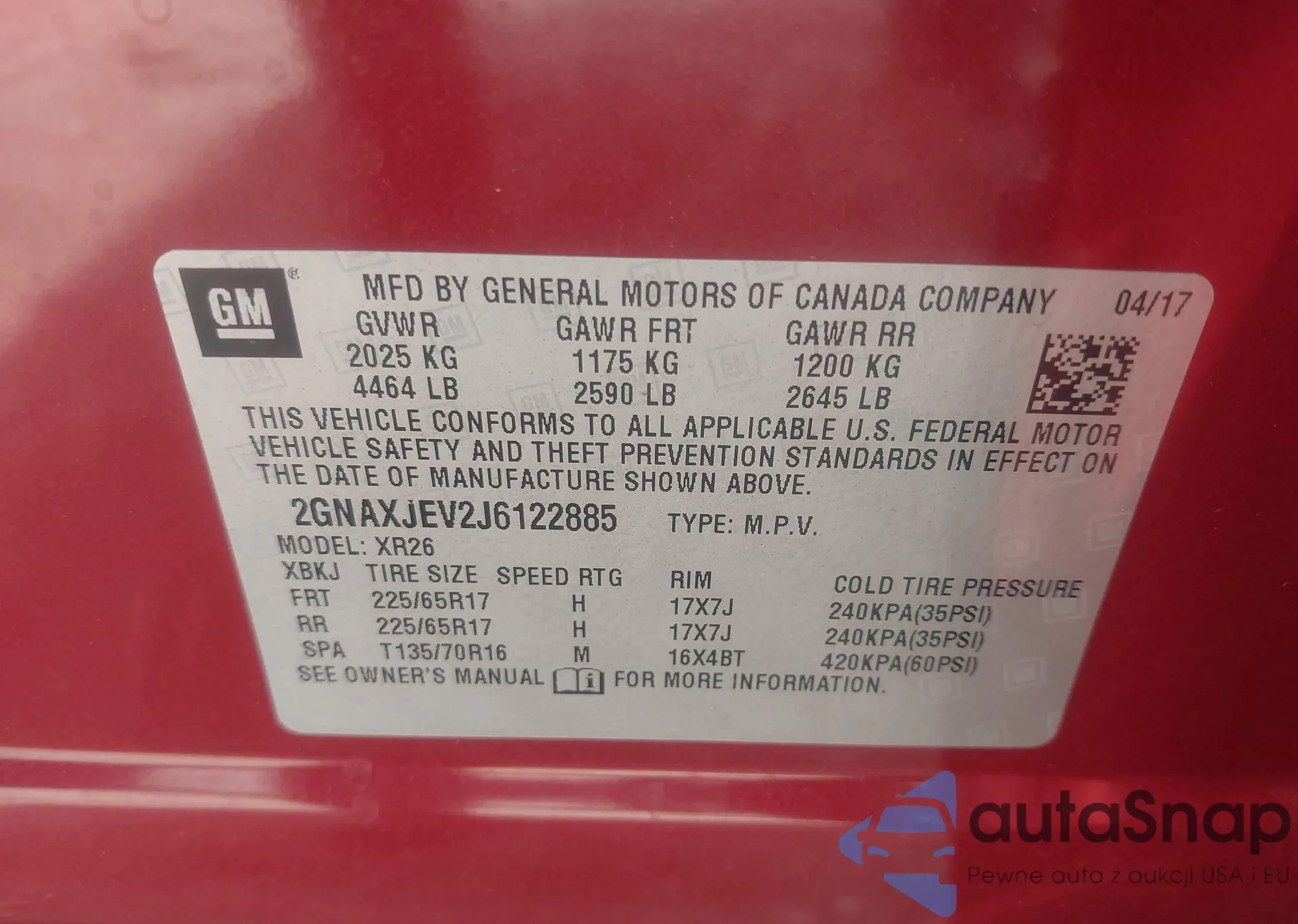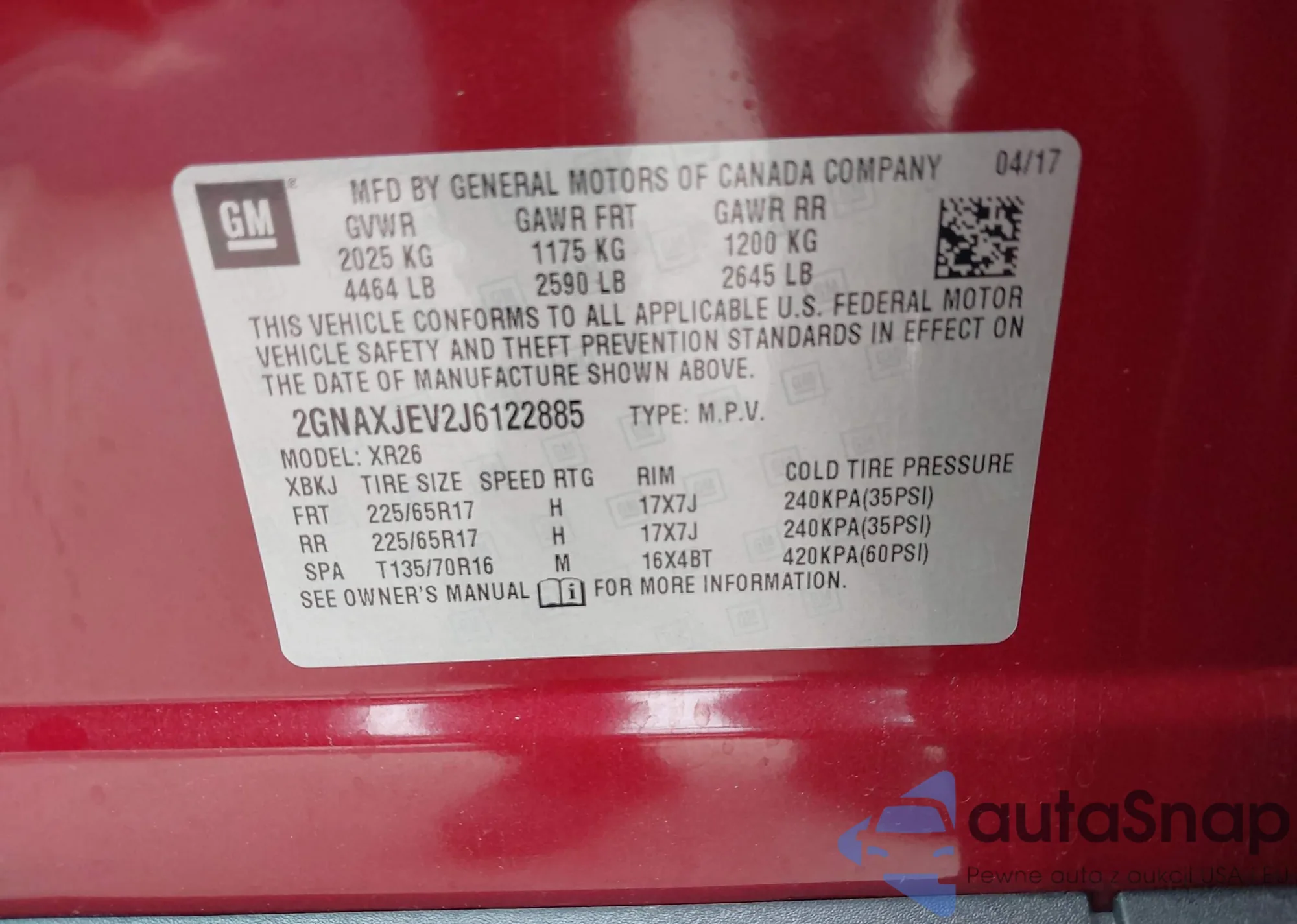 LOT: 43272337 VIN: 2GNAXJEV2J6122885