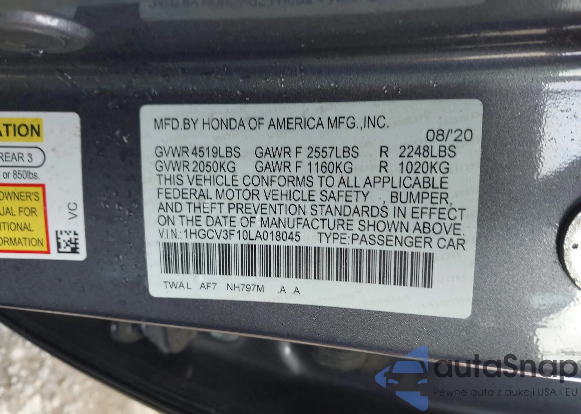 LOT: 43715262 VIN: 1HGCV3F10LA018045