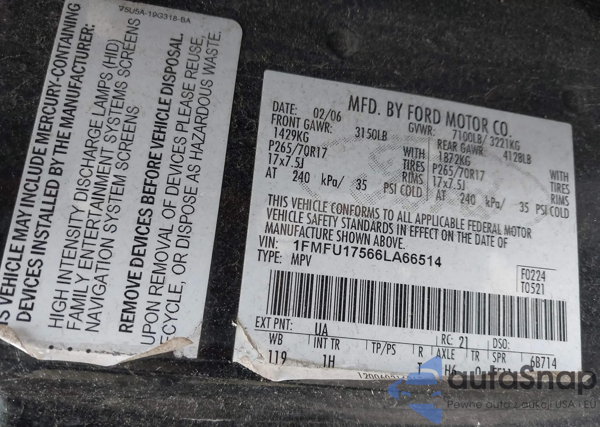 LOT: 43614867 VIN: 1FMFU17566LA66514