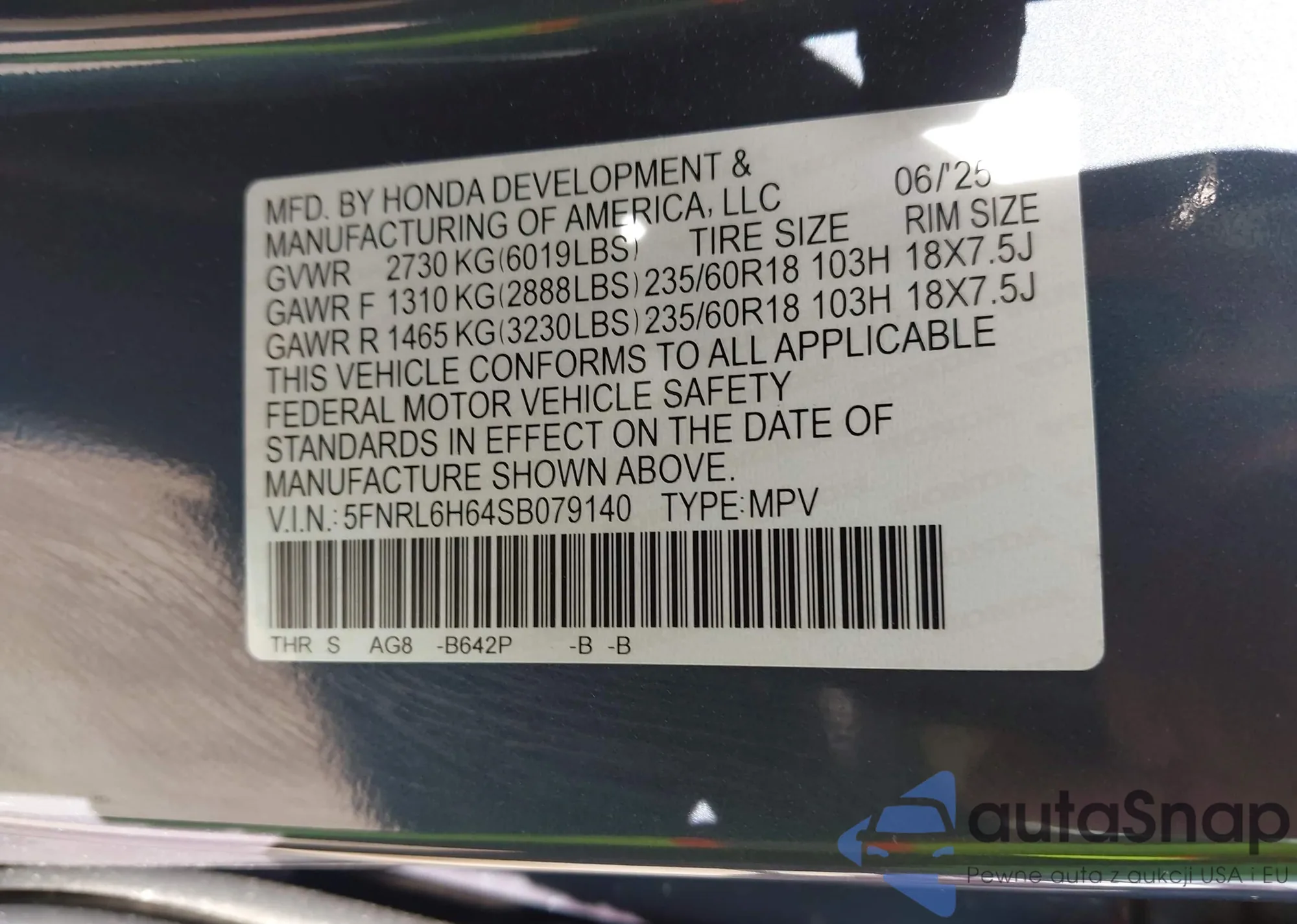 • VIN 5FNRL6H64SB079140