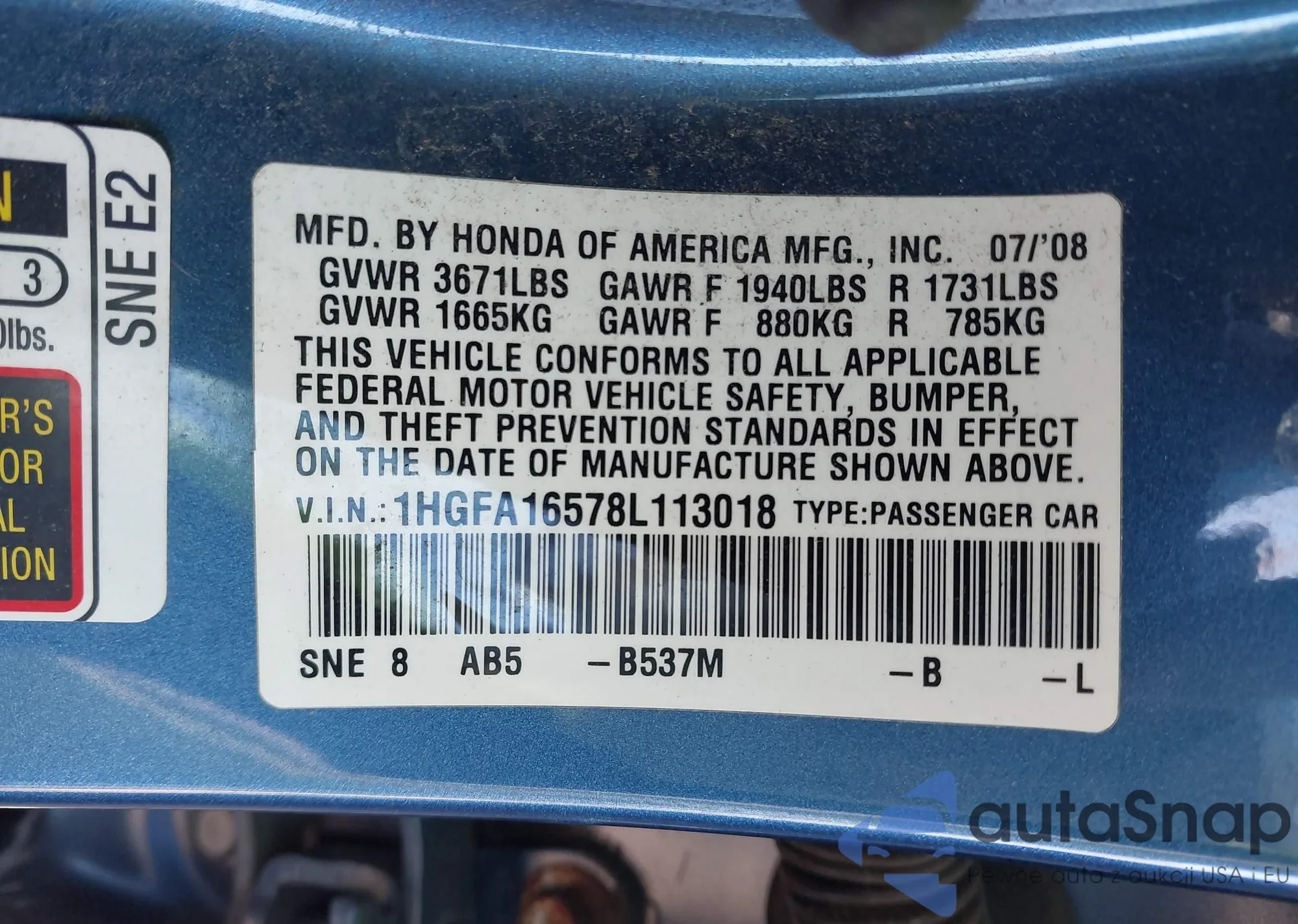 LOT: 43590053 VIN: 1HGFA16578L113018