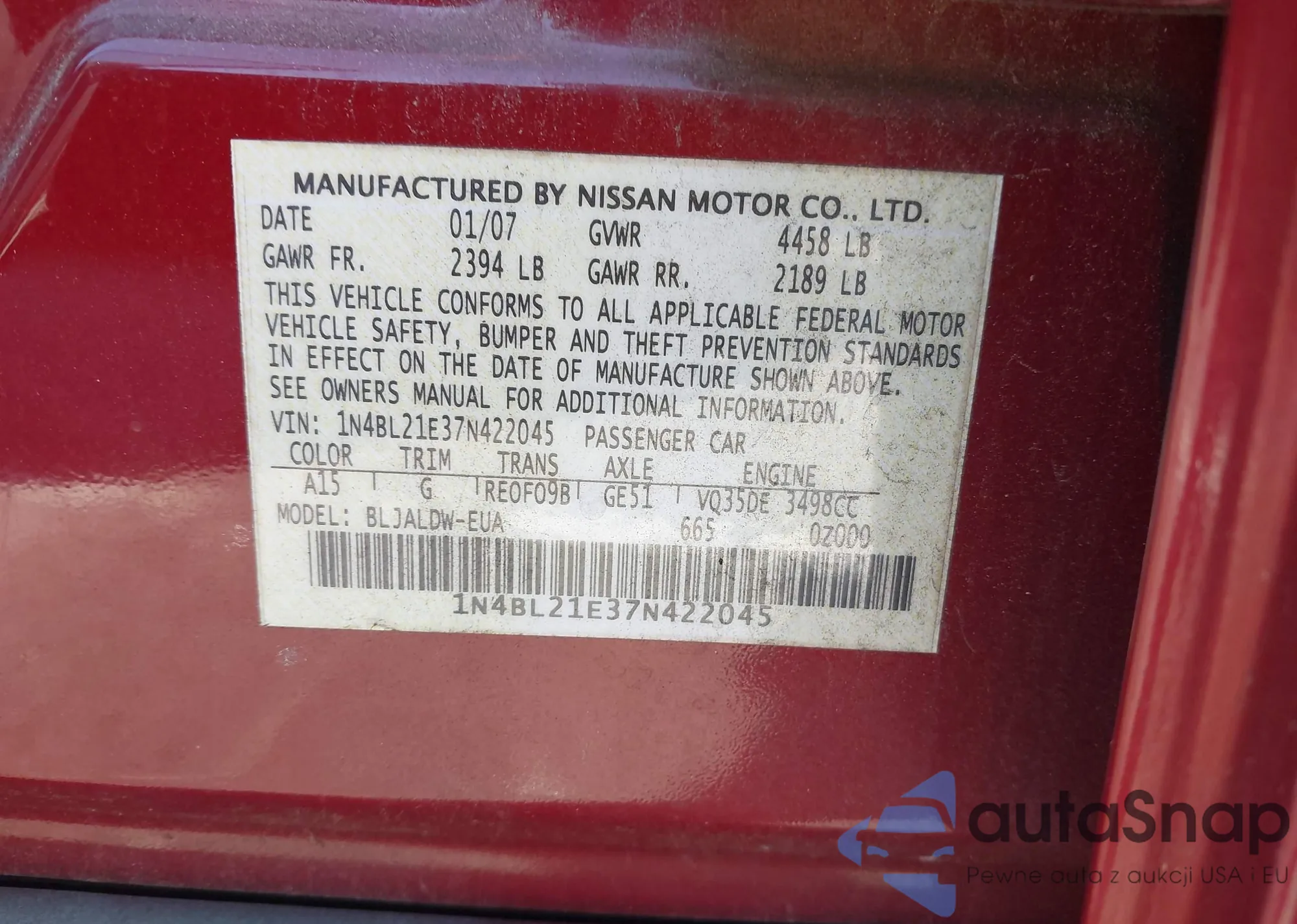 LOT: 43596478 VIN: 1N4BL21E37N422045