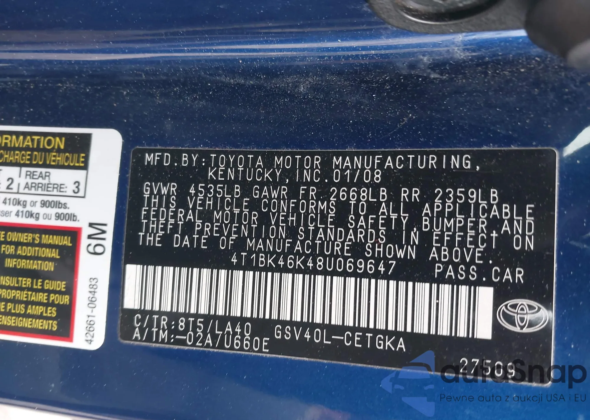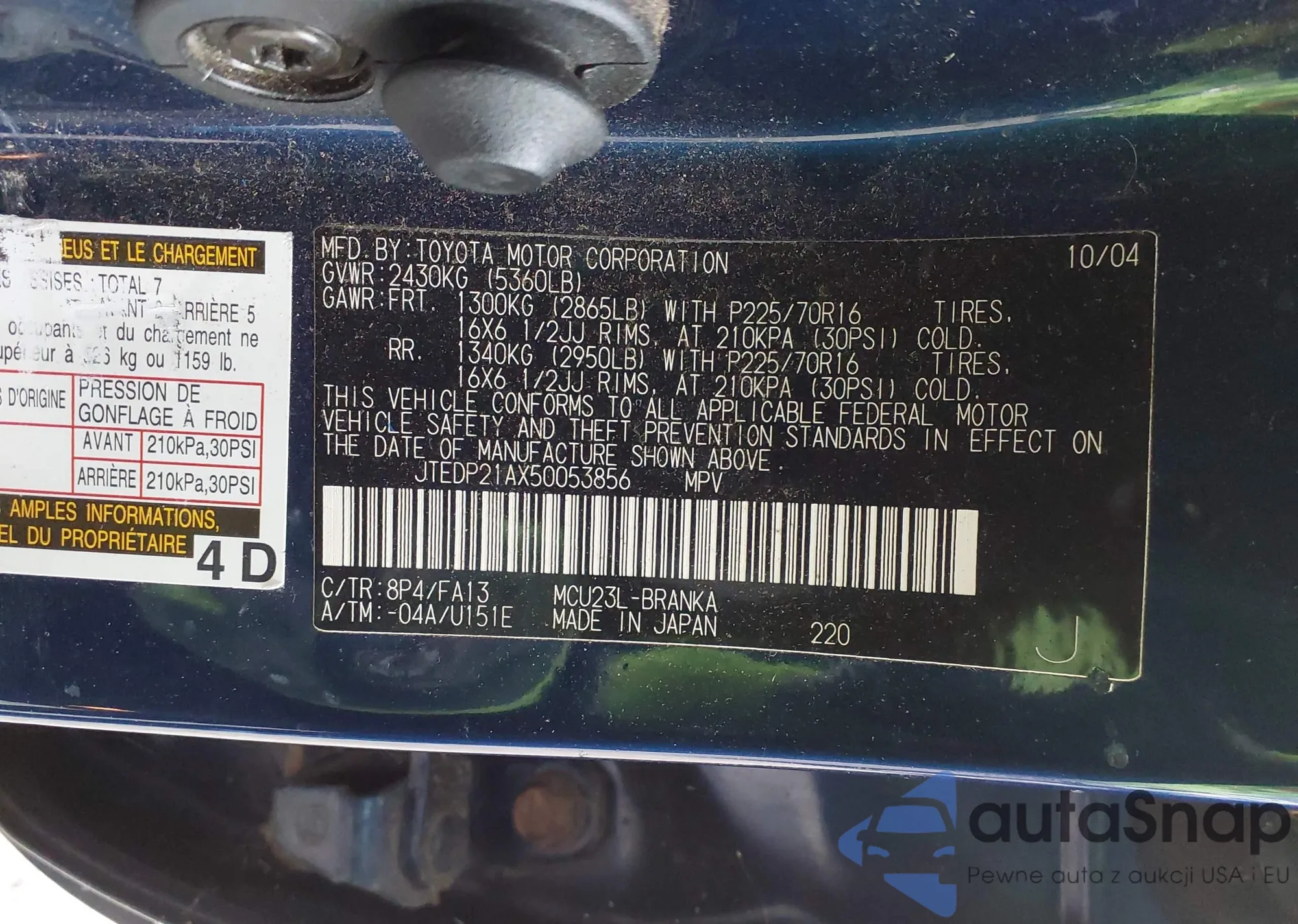 LOT: 43693719 VIN: JTEDP21AX50053856