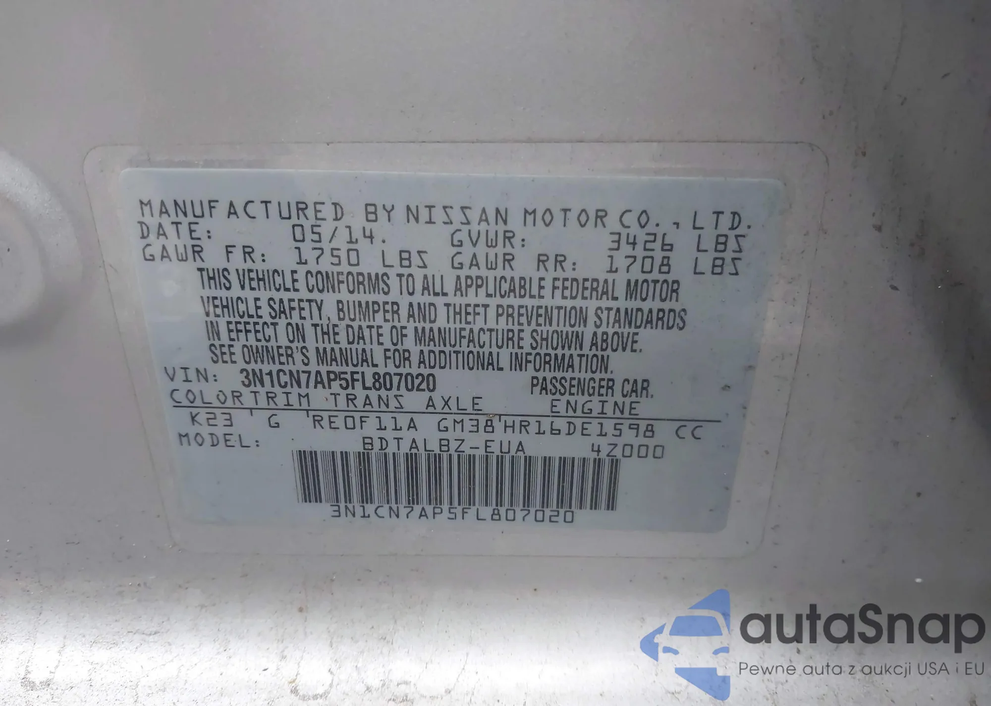 LOT: 43431795 VIN: 1N4BA41EX7C807941