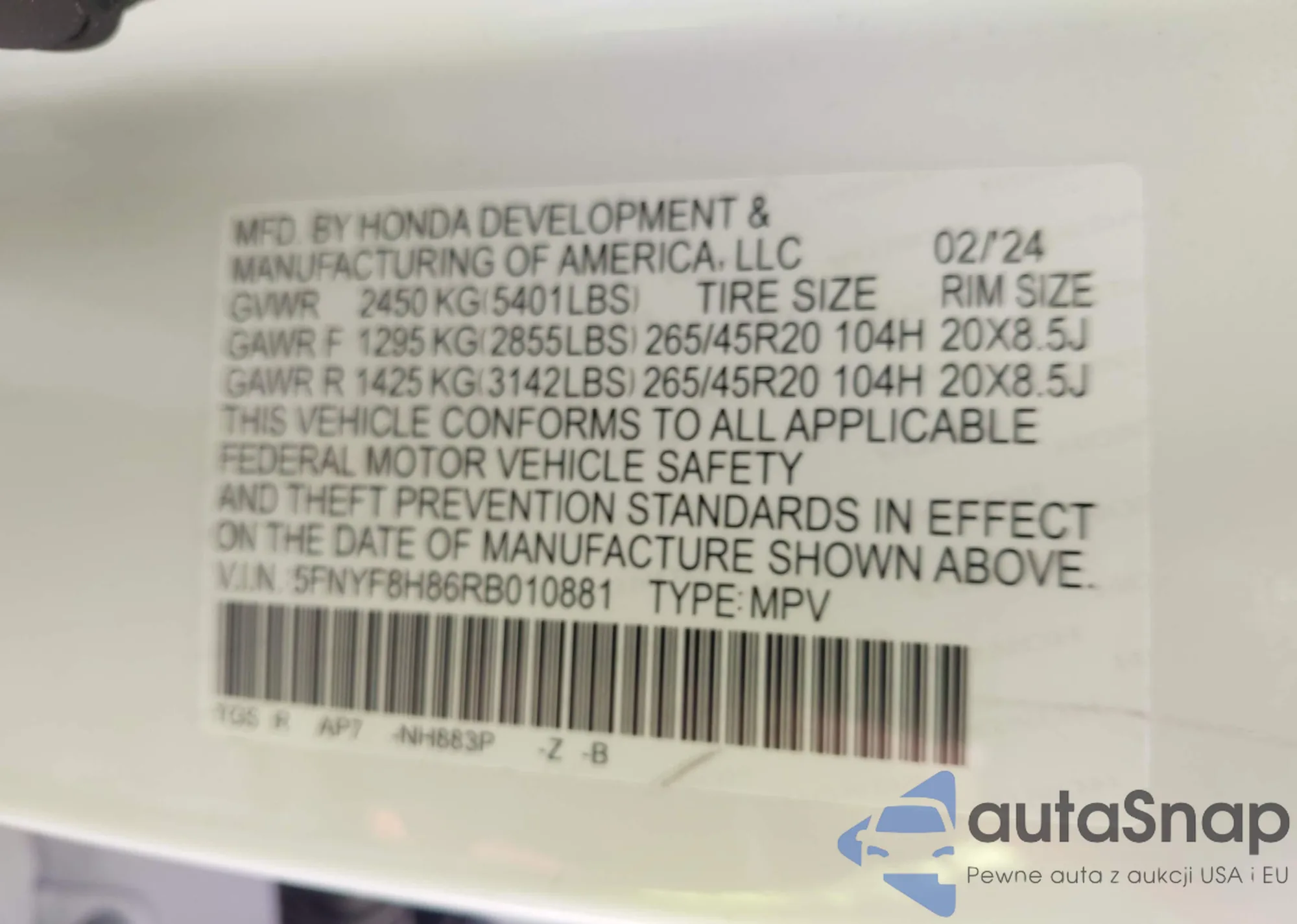 LOT: 43421809 VIN: 5FNYF8H86RB010881
