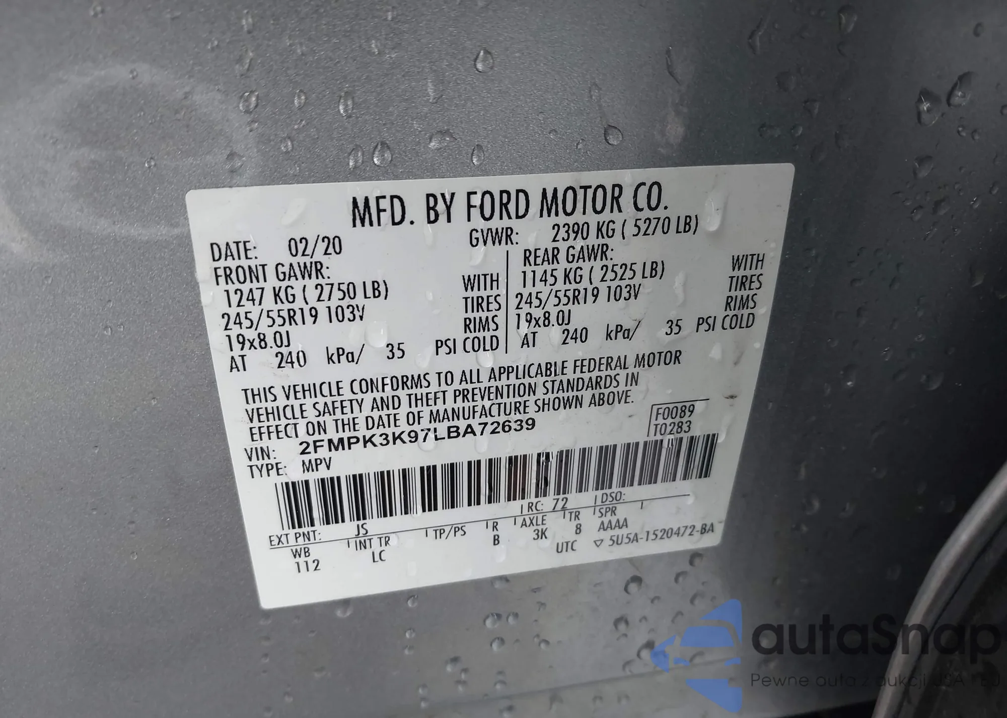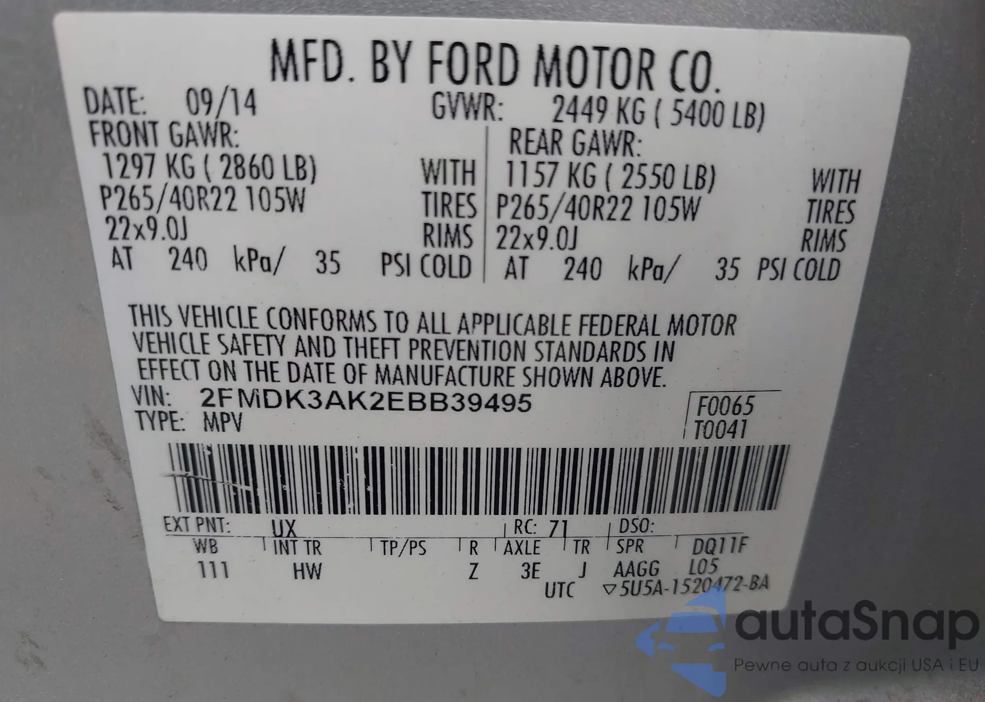 LOT: 43441975 VIN: 2FMDK3AK2EBB39495